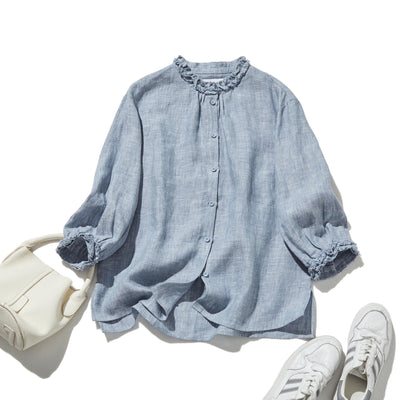 フロントフリルが可愛い フランチリネン100% シャツブラウス 250913