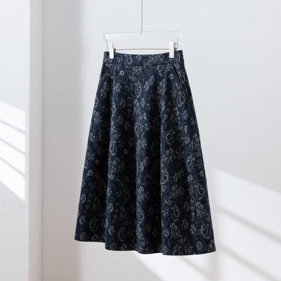 【秋冬の定番】ボリュームシルエットが華やか!エレガントな柄スカート 紺色 251112-1