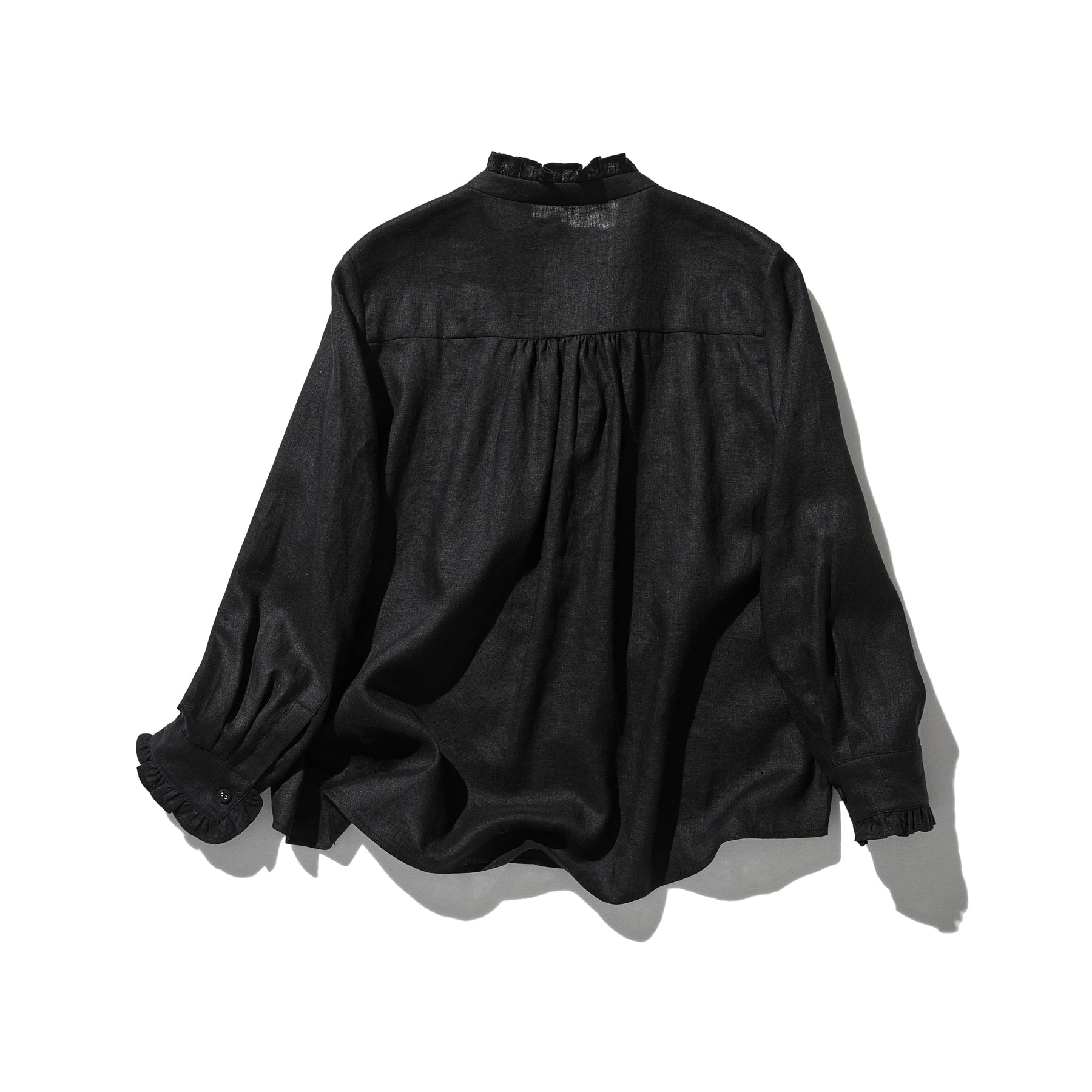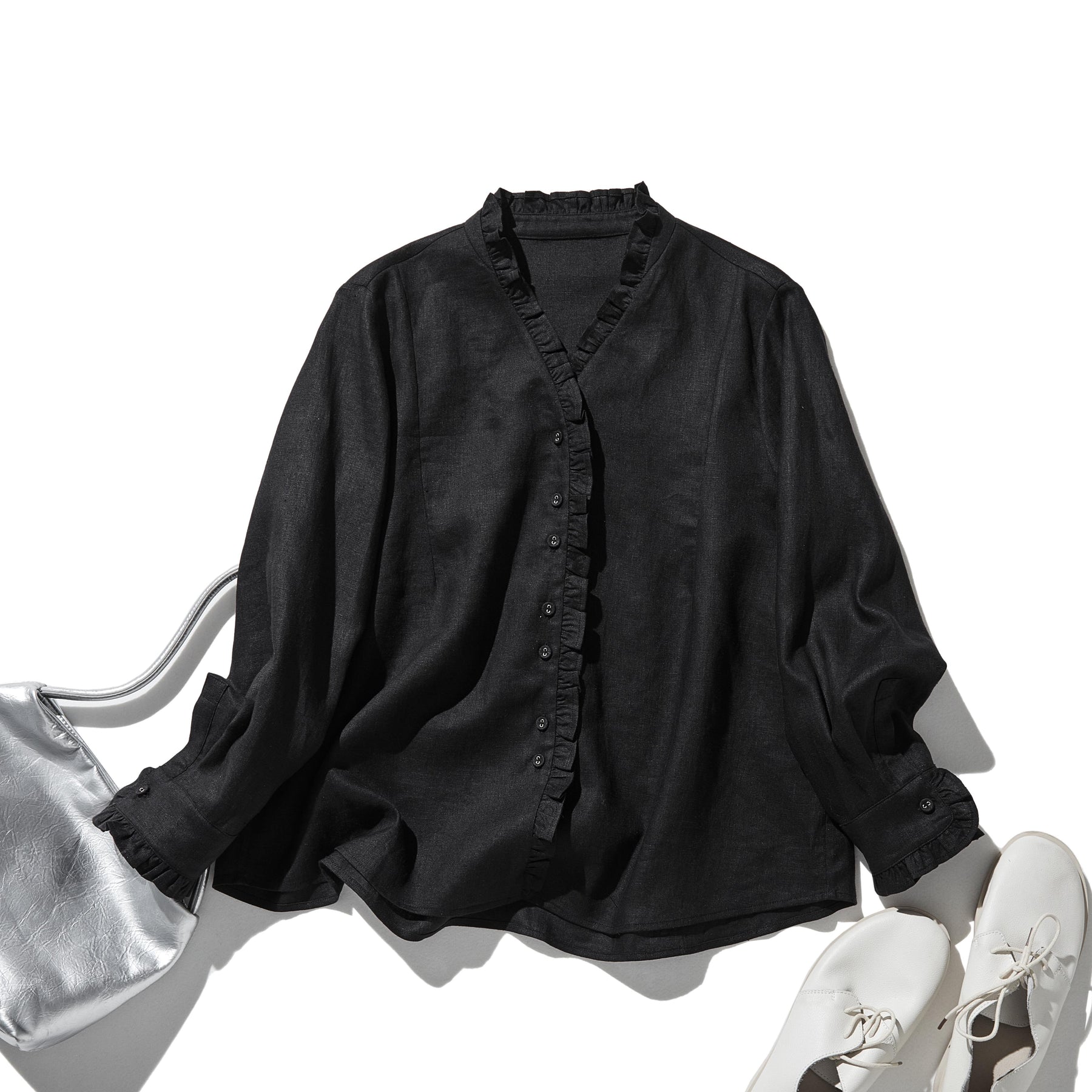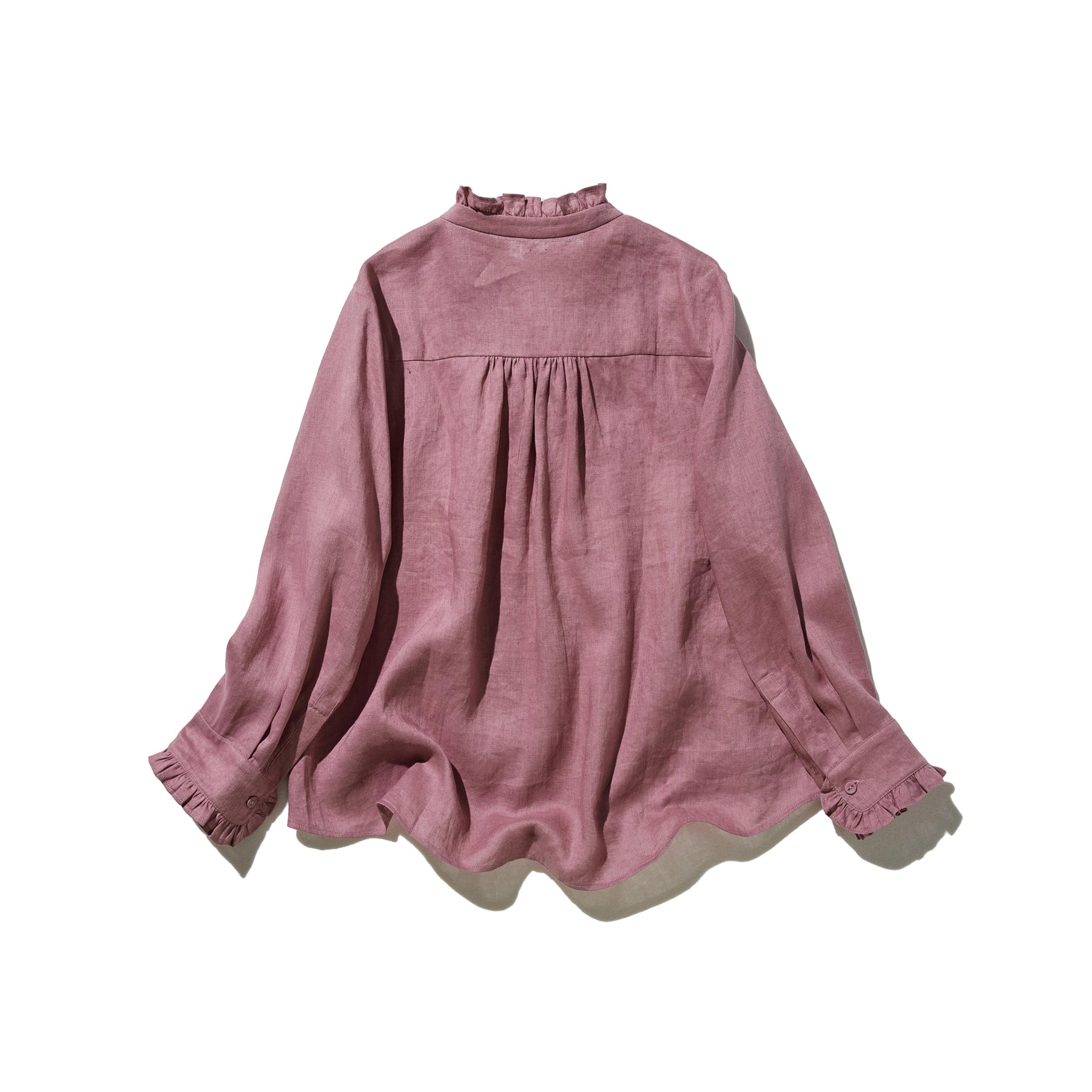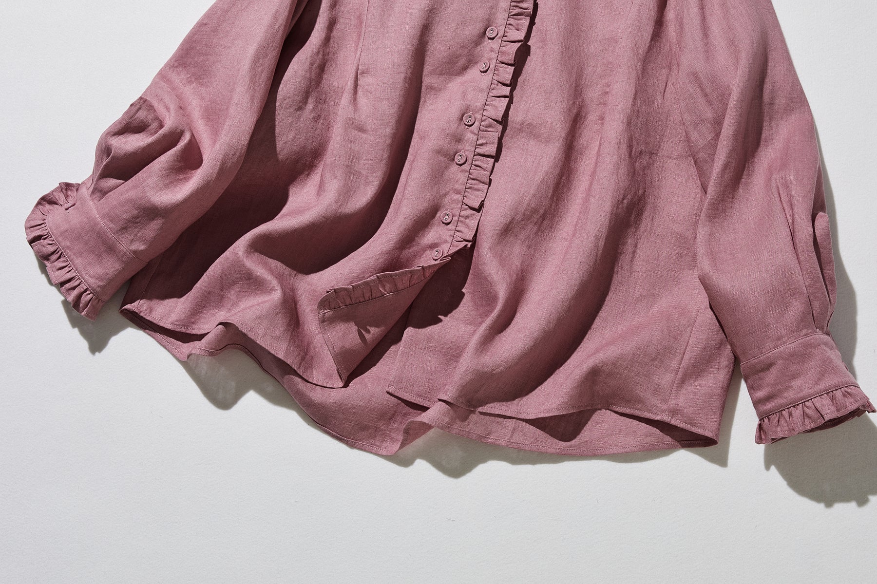 フリルデティールの立体裁断シャツ 長袖 リネンシャツブラウス 250809【商品の特徴】•女性らしいシルエット: 肩周りはすっきりとフィットし、ボディはゆったりとしたAラインシルエットでまとめました。背面に施された細かいギャザーが、動きの際のゆとりと優雅な広がりを生み出し、繊細な女性らしさを印象づけます。•華やかなデザイン詳細:o首元から前身頃にかけて流れるようなフリルデティールが、顔周りを明るく華やかに引き立てます。o袖口も前身頃と同様のフリルをあしらい、上品でこだわりを感じる仕様に。仕事やちょっとしたお出かけシーンでも、差をつける一点です。•美しい穿き心地と機能性:o前身頃は立体裁断を採用。身体に程よく沿いながらも余分な肉感を繊細にカバーし、洗練されたシルエットに整えます。o全てのボタンには生地と同じリネンを使用した包みボタンを採用。細部までこだわりを感じる、品格のある仕上がりです。【おすすめの着こなし方】•スマートなスタイルに: 白やベージュのスラックスやスカートに合わせ、フリルをアクセントにしたネックレスでまとめれば、仕事や打ち合わせシーンでも印象的なきちんとコーディネートが完成します。•リラックスした休日スタイルに: デニムやカーゴパンツなどのカジュアルアイテムと組み合わせれば、上質なリネン素材と甘いフリルの絶妙なバランスが、洗練されたラフな魅力に。捲った袖口から見えるフリルもおしゃれです。•レイヤードスタイルの要として: 春先や秋口には、ジャケットやカーディガンの下にインナーとして。首元や袖から覗くフリルが、重ね着の立体感と華やかさをプラスします。「どこか特別な一枚」を求めている方へ。素材の良さ、シルエットの美しさ、そしてこだわりのデティールがひとつになった、とっておきのリネンシャツです。季節を問わず長く愛用できる、トレンドに流されない一生モノのアイテムとして、ぜひあなたのワードローブに加えてください。素材:リネン100%サイズ:身丈前60cm後64cmバスト105cm肩幅39cm袖丈53cm袖口22cmアームホール49cm首回り56cm裾130cm透け感:なし裏地:なしポケット:なし伸縮性:なし光沢感:なしシーズン:春、夏、秋