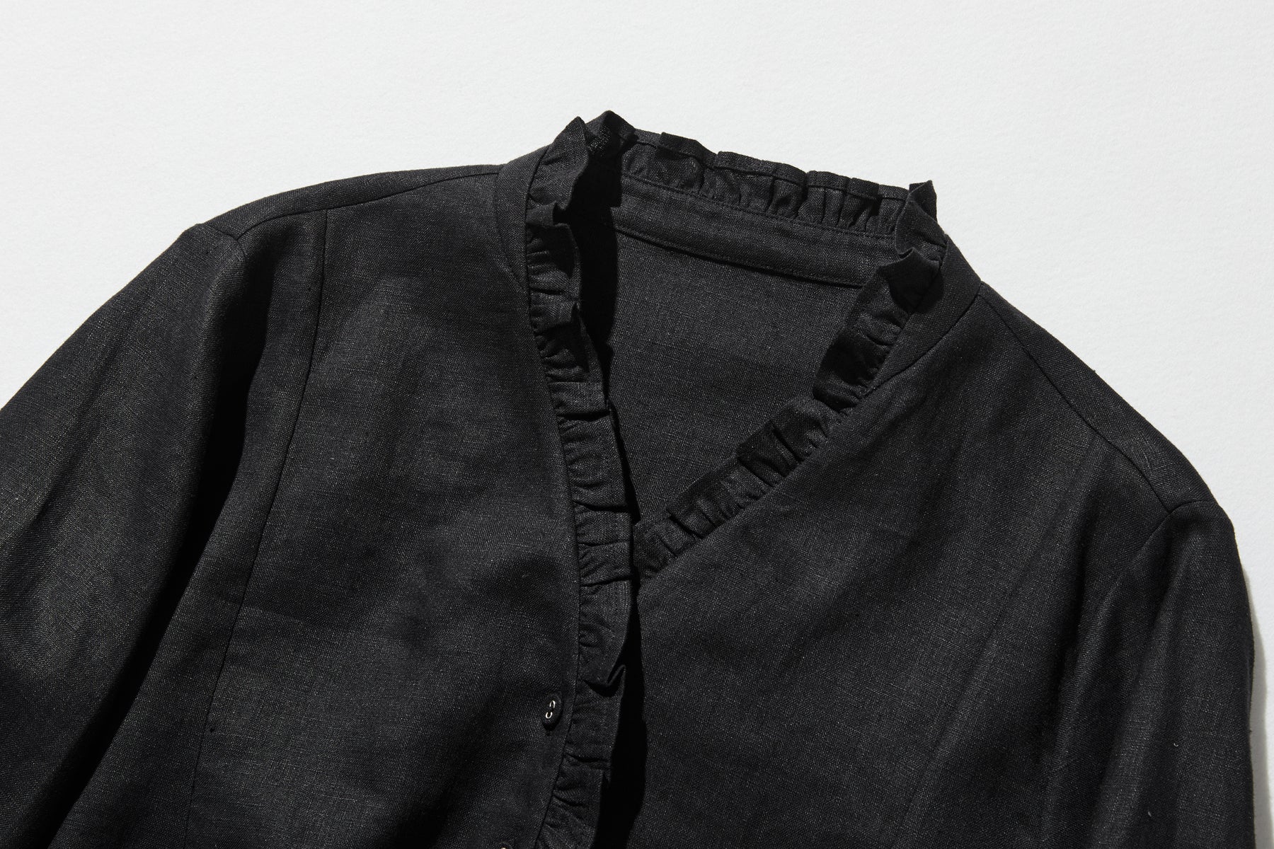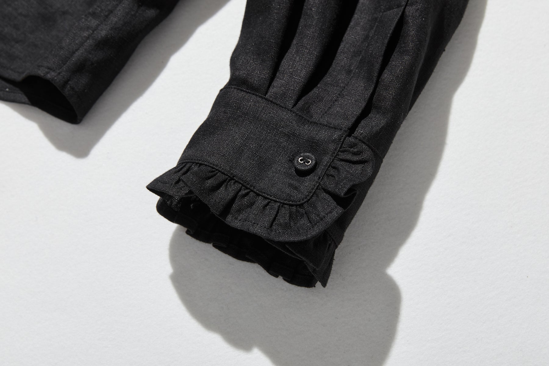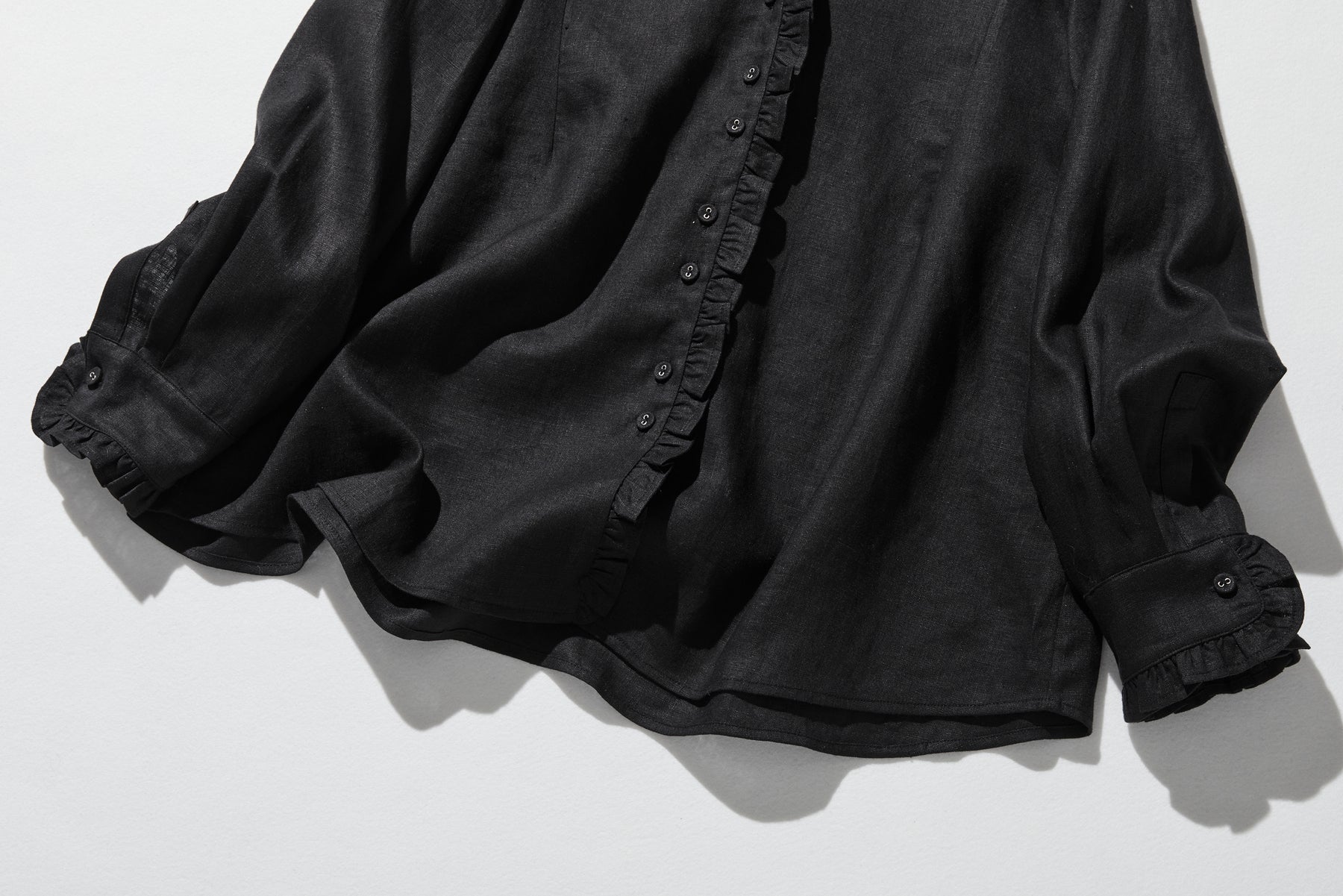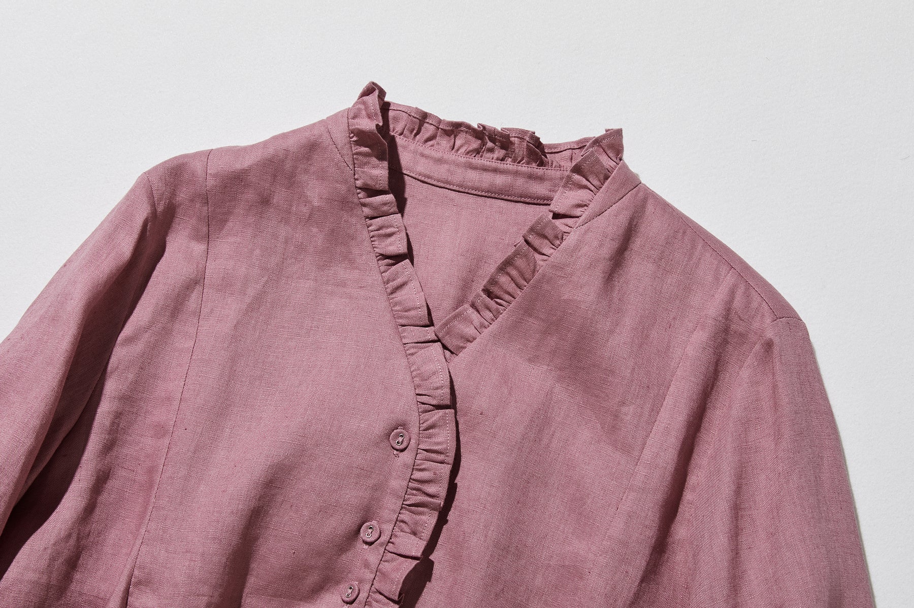 フリルデティールの立体裁断シャツ 長袖 リネンシャツブラウス 250809【商品の特徴】•女性らしいシルエット: 肩周りはすっきりとフィットし、ボディはゆったりとしたAラインシルエットでまとめました。背面に施された細かいギャザーが、動きの際のゆとりと優雅な広がりを生み出し、繊細な女性らしさを印象づけます。•華やかなデザイン詳細:o首元から前身頃にかけて流れるようなフリルデティールが、顔周りを明るく華やかに引き立てます。o袖口も前身頃と同様のフリルをあしらい、上品でこだわりを感じる仕様に。仕事やちょっとしたお出かけシーンでも、差をつける一点です。•美しい穿き心地と機能性:o前身頃は立体裁断を採用。身体に程よく沿いながらも余分な肉感を繊細にカバーし、洗練されたシルエットに整えます。o全てのボタンには生地と同じリネンを使用した包みボタンを採用。細部までこだわりを感じる、品格のある仕上がりです。【おすすめの着こなし方】•スマートなスタイルに: 白やベージュのスラックスやスカートに合わせ、フリルをアクセントにしたネックレスでまとめれば、仕事や打ち合わせシーンでも印象的なきちんとコーディネートが完成します。•リラックスした休日スタイルに: デニムやカーゴパンツなどのカジュアルアイテムと組み合わせれば、上質なリネン素材と甘いフリルの絶妙なバランスが、洗練されたラフな魅力に。捲った袖口から見えるフリルもおしゃれです。•レイヤードスタイルの要として: 春先や秋口には、ジャケットやカーディガンの下にインナーとして。首元や袖から覗くフリルが、重ね着の立体感と華やかさをプラスします。「どこか特別な一枚」を求めている方へ。素材の良さ、シルエットの美しさ、そしてこだわりのデティールがひとつになった、とっておきのリネンシャツです。季節を問わず長く愛用できる、トレンドに流されない一生モノのアイテムとして、ぜひあなたのワードローブに加えてください。素材:リネン100%サイズ:身丈前60cm後64cmバスト105cm肩幅39cm袖丈53cm袖口22cmアームホール49cm首回り56cm裾130cm透け感:なし裏地:なしポケット:なし伸縮性:なし光沢感:なしシーズン:春、夏、秋