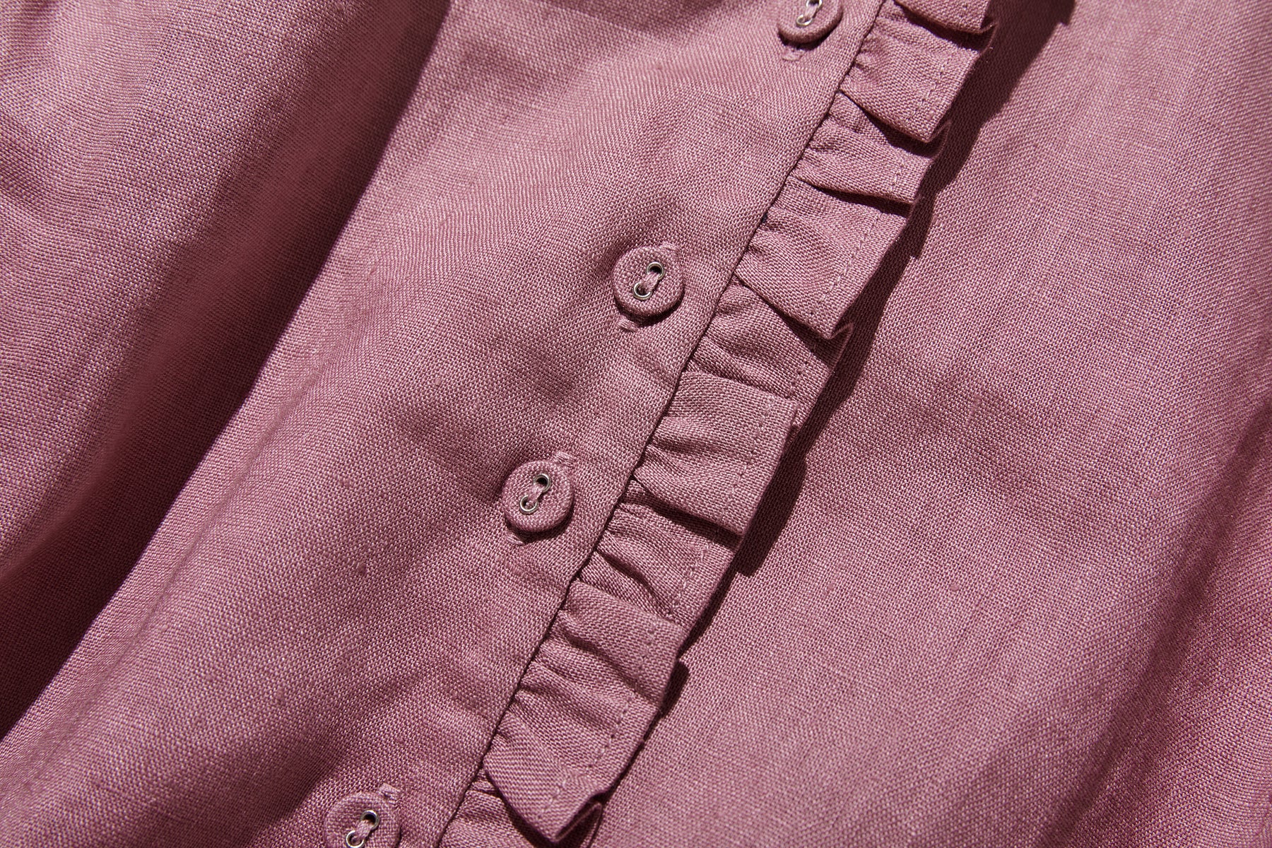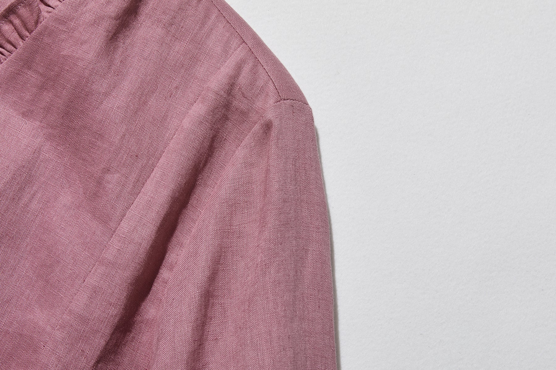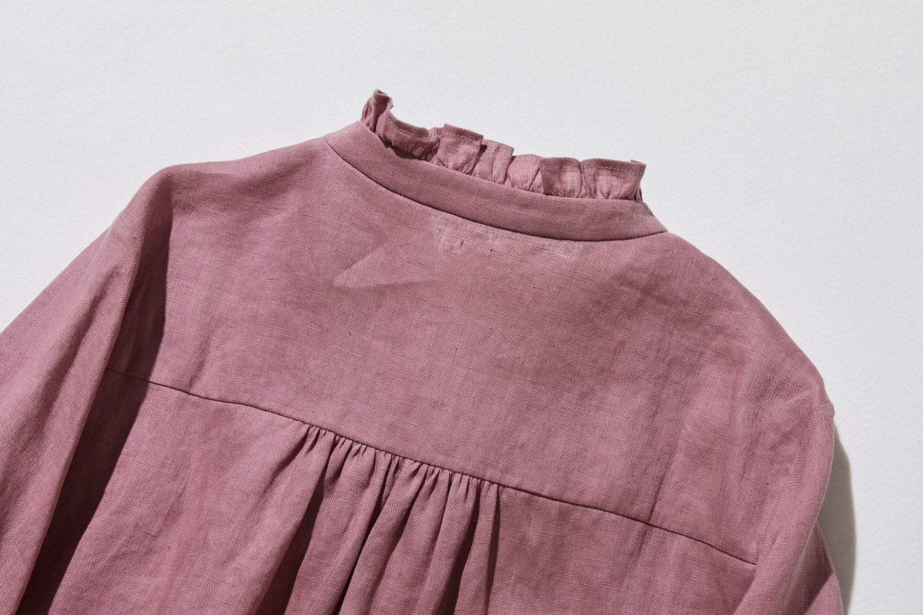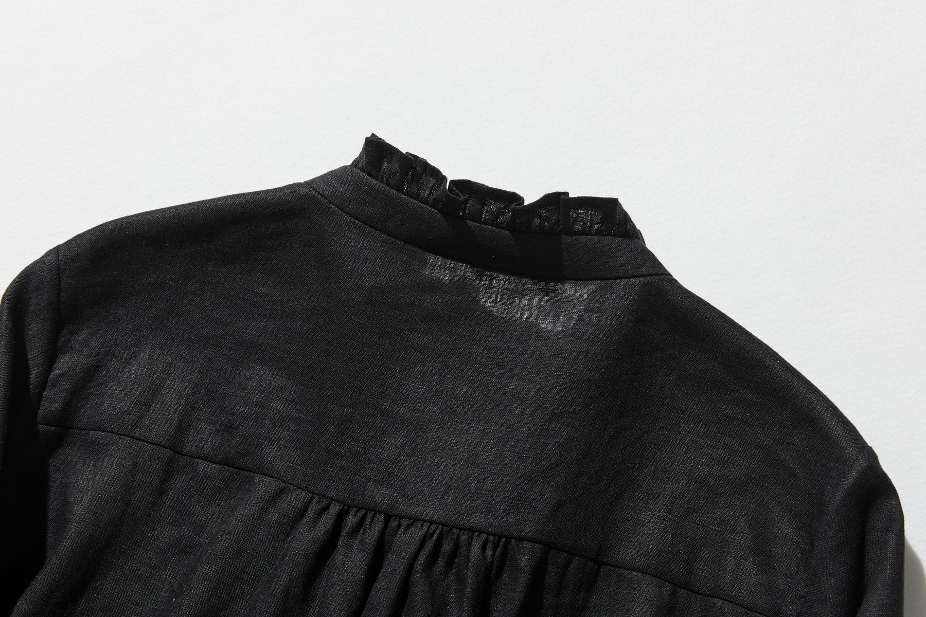 フリルデティールの立体裁断シャツ 長袖 リネンシャツブラウス 250809【商品の特徴】•女性らしいシルエット: 肩周りはすっきりとフィットし、ボディはゆったりとしたAラインシルエットでまとめました。背面に施された細かいギャザーが、動きの際のゆとりと優雅な広がりを生み出し、繊細な女性らしさを印象づけます。•華やかなデザイン詳細:o首元から前身頃にかけて流れるようなフリルデティールが、顔周りを明るく華やかに引き立てます。o袖口も前身頃と同様のフリルをあしらい、上品でこだわりを感じる仕様に。仕事やちょっとしたお出かけシーンでも、差をつける一点です。•美しい穿き心地と機能性:o前身頃は立体裁断を採用。身体に程よく沿いながらも余分な肉感を繊細にカバーし、洗練されたシルエットに整えます。o全てのボタンには生地と同じリネンを使用した包みボタンを採用。細部までこだわりを感じる、品格のある仕上がりです。【おすすめの着こなし方】•スマートなスタイルに: 白やベージュのスラックスやスカートに合わせ、フリルをアクセントにしたネックレスでまとめれば、仕事や打ち合わせシーンでも印象的なきちんとコーディネートが完成します。•リラックスした休日スタイルに: デニムやカーゴパンツなどのカジュアルアイテムと組み合わせれば、上質なリネン素材と甘いフリルの絶妙なバランスが、洗練されたラフな魅力に。捲った袖口から見えるフリルもおしゃれです。•レイヤードスタイルの要として: 春先や秋口には、ジャケットやカーディガンの下にインナーとして。首元や袖から覗くフリルが、重ね着の立体感と華やかさをプラスします。「どこか特別な一枚」を求めている方へ。素材の良さ、シルエットの美しさ、そしてこだわりのデティールがひとつになった、とっておきのリネンシャツです。季節を問わず長く愛用できる、トレンドに流されない一生モノのアイテムとして、ぜひあなたのワードローブに加えてください。素材:リネン100%サイズ:身丈前60cm後64cmバスト105cm肩幅39cm袖丈53cm袖口22cmアームホール49cm首回り56cm裾130cm透け感:なし裏地:なしポケット:なし伸縮性:なし光沢感:なしシーズン:春、夏、秋