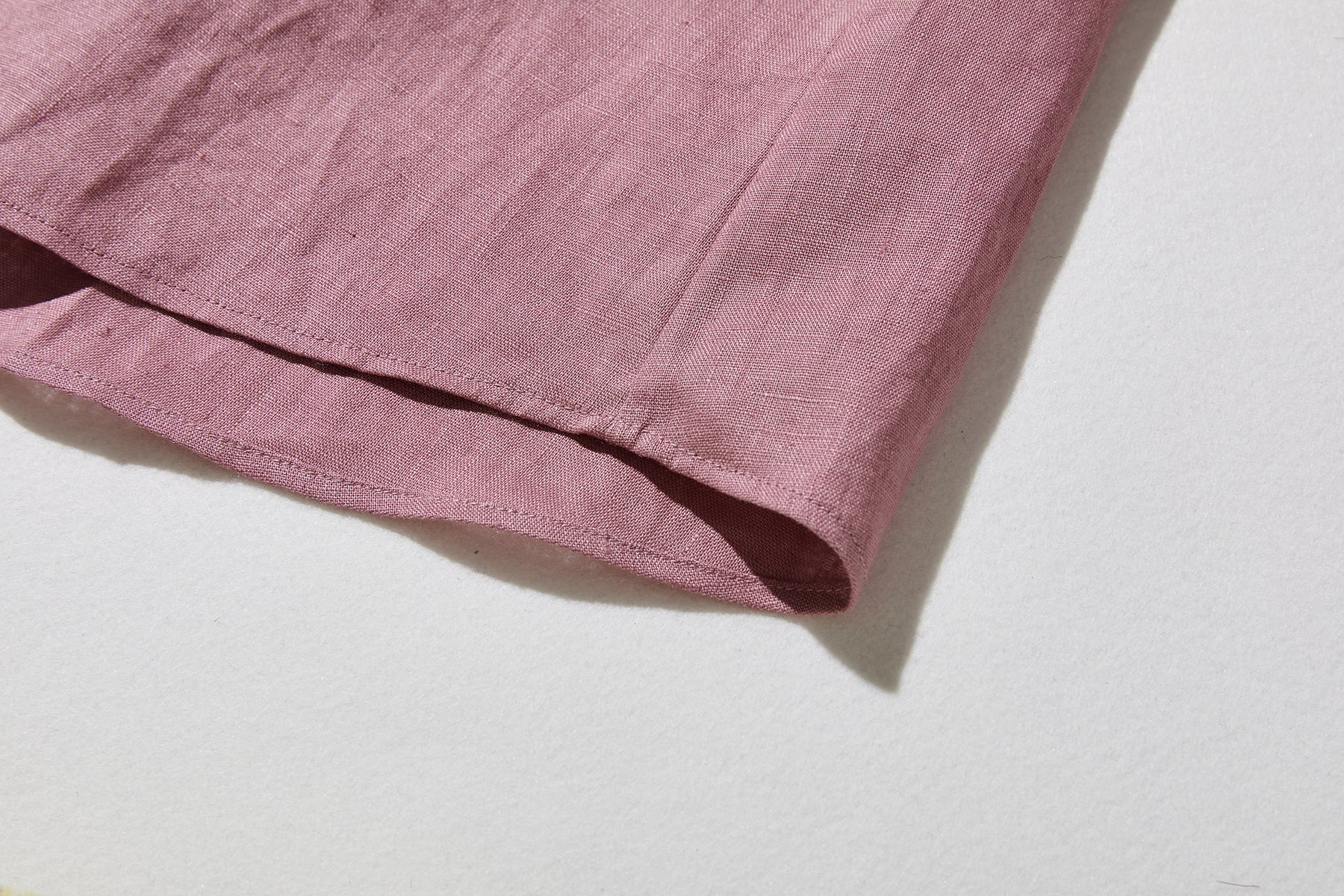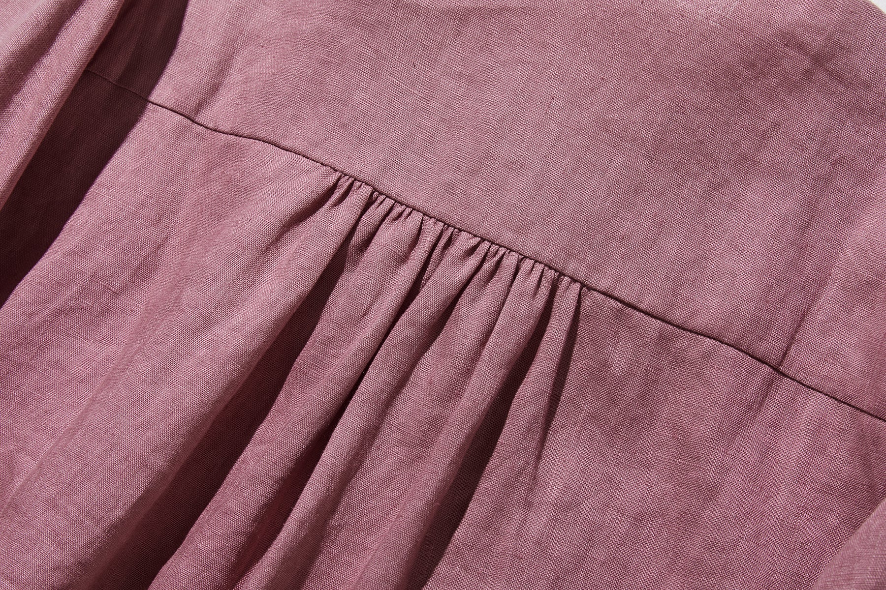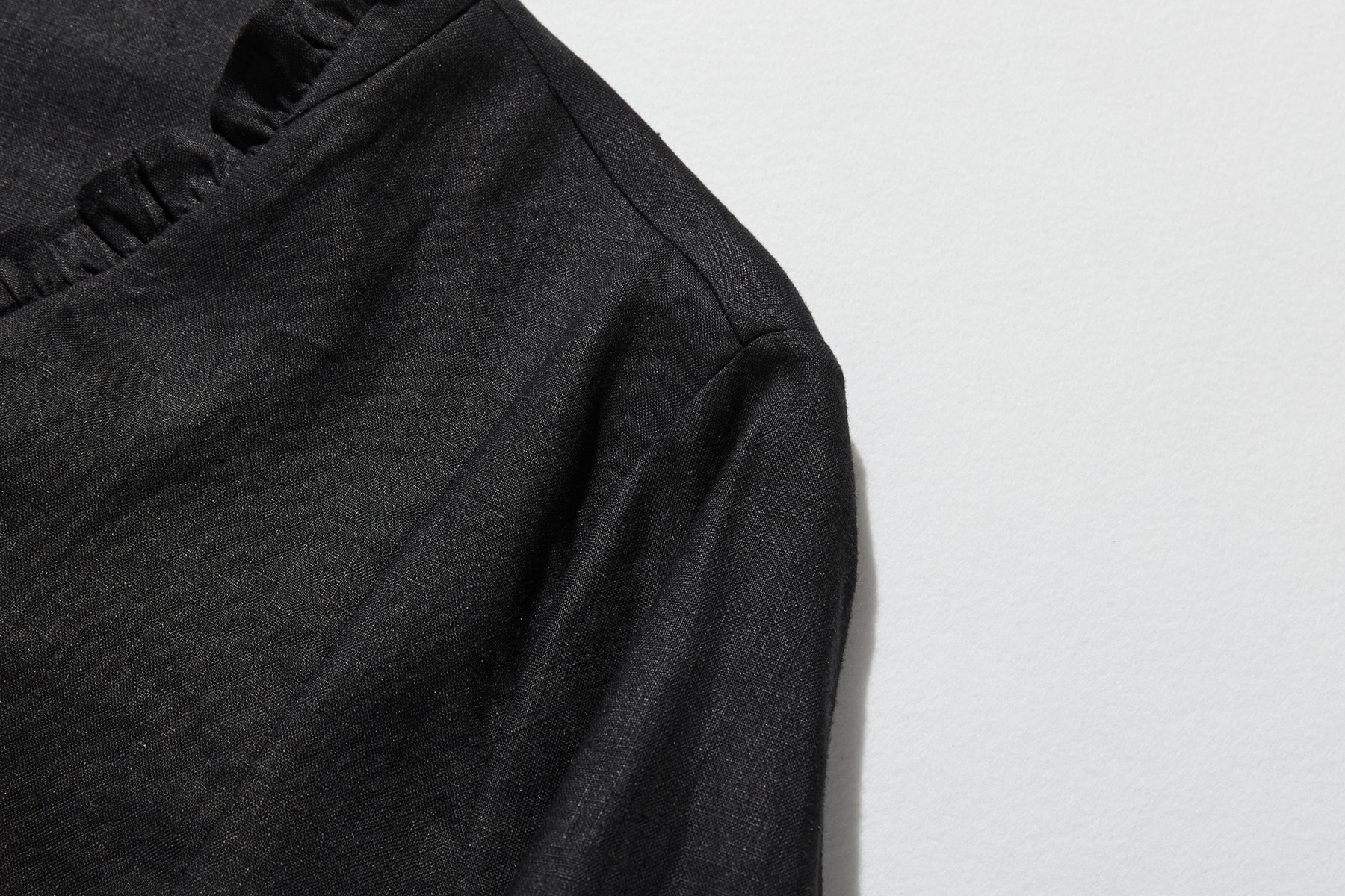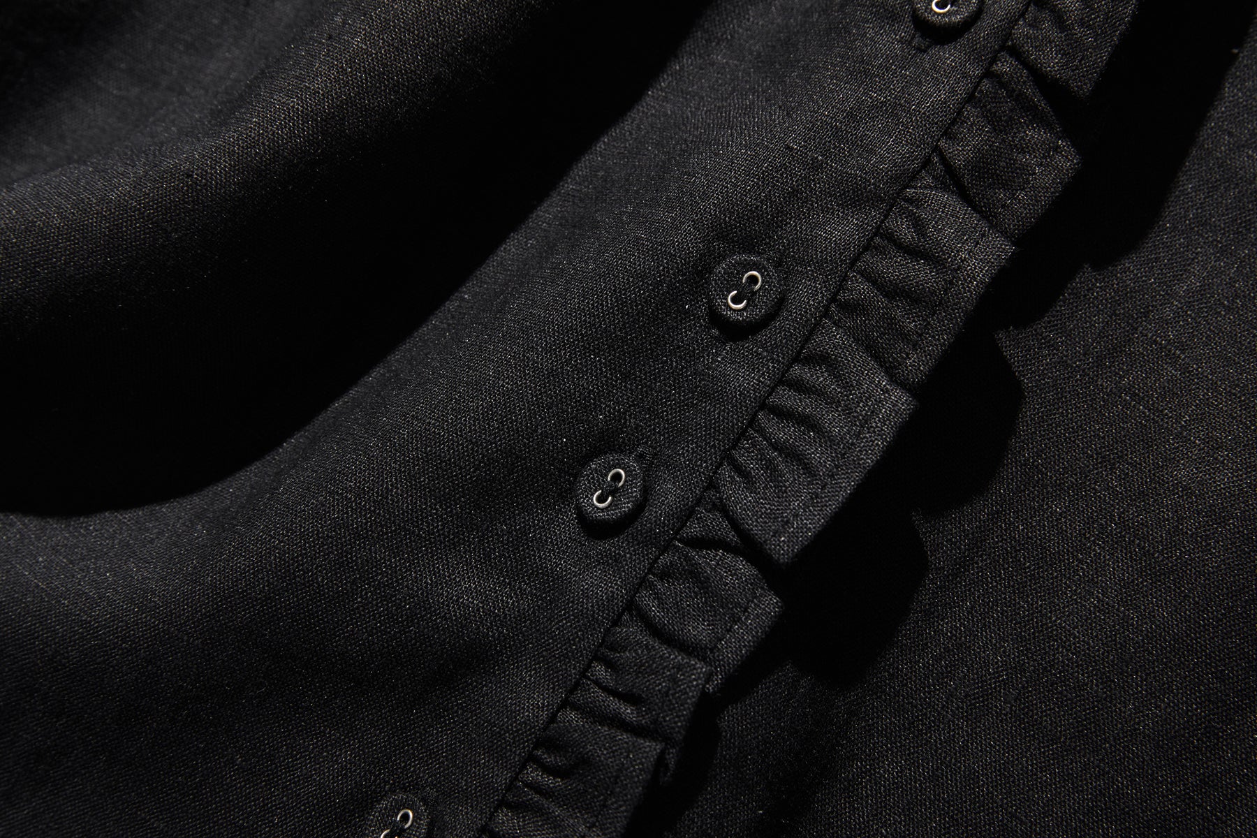 フリルデティールの立体裁断シャツ 長袖 リネンシャツブラウス 250809【商品の特徴】•女性らしいシルエット: 肩周りはすっきりとフィットし、ボディはゆったりとしたAラインシルエットでまとめました。背面に施された細かいギャザーが、動きの際のゆとりと優雅な広がりを生み出し、繊細な女性らしさを印象づけます。•華やかなデザイン詳細:o首元から前身頃にかけて流れるようなフリルデティールが、顔周りを明るく華やかに引き立てます。o袖口も前身頃と同様のフリルをあしらい、上品でこだわりを感じる仕様に。仕事やちょっとしたお出かけシーンでも、差をつける一点です。•美しい穿き心地と機能性:o前身頃は立体裁断を採用。身体に程よく沿いながらも余分な肉感を繊細にカバーし、洗練されたシルエットに整えます。o全てのボタンには生地と同じリネンを使用した包みボタンを採用。細部までこだわりを感じる、品格のある仕上がりです。【おすすめの着こなし方】•スマートなスタイルに: 白やベージュのスラックスやスカートに合わせ、フリルをアクセントにしたネックレスでまとめれば、仕事や打ち合わせシーンでも印象的なきちんとコーディネートが完成します。•リラックスした休日スタイルに: デニムやカーゴパンツなどのカジュアルアイテムと組み合わせれば、上質なリネン素材と甘いフリルの絶妙なバランスが、洗練されたラフな魅力に。捲った袖口から見えるフリルもおしゃれです。•レイヤードスタイルの要として: 春先や秋口には、ジャケットやカーディガンの下にインナーとして。首元や袖から覗くフリルが、重ね着の立体感と華やかさをプラスします。「どこか特別な一枚」を求めている方へ。素材の良さ、シルエットの美しさ、そしてこだわりのデティールがひとつになった、とっておきのリネンシャツです。季節を問わず長く愛用できる、トレンドに流されない一生モノのアイテムとして、ぜひあなたのワードローブに加えてください。素材:リネン100%サイズ:身丈前60cm後64cmバスト105cm肩幅39cm袖丈53cm袖口22cmアームホール49cm首回り56cm裾130cm透け感:なし裏地:なしポケット:なし伸縮性:なし光沢感:なしシーズン:春、夏、秋