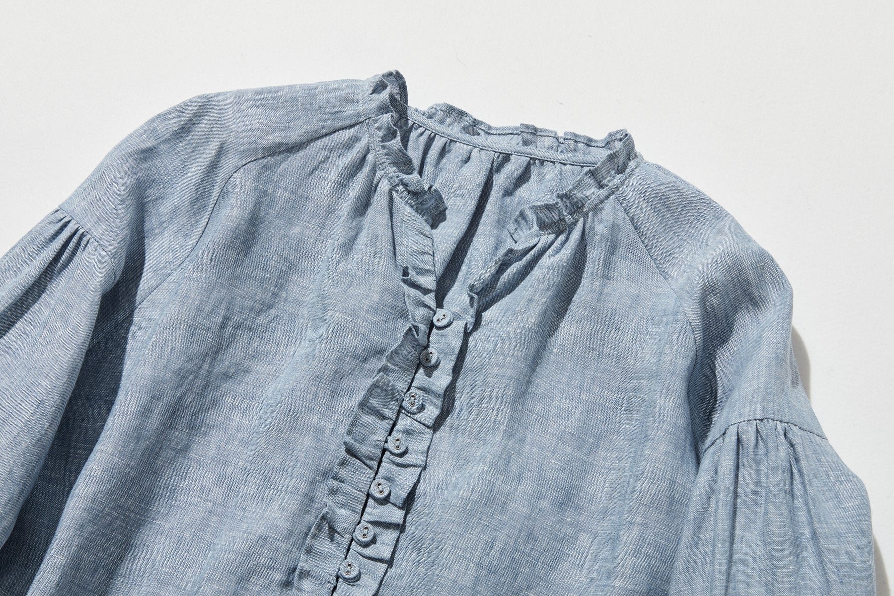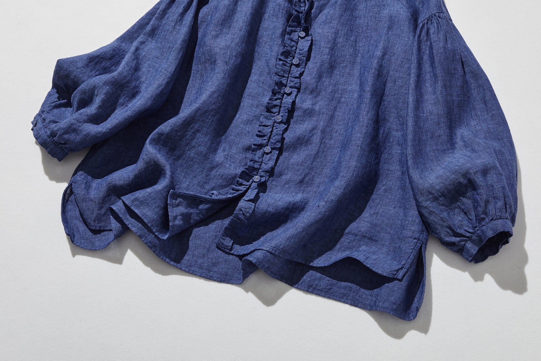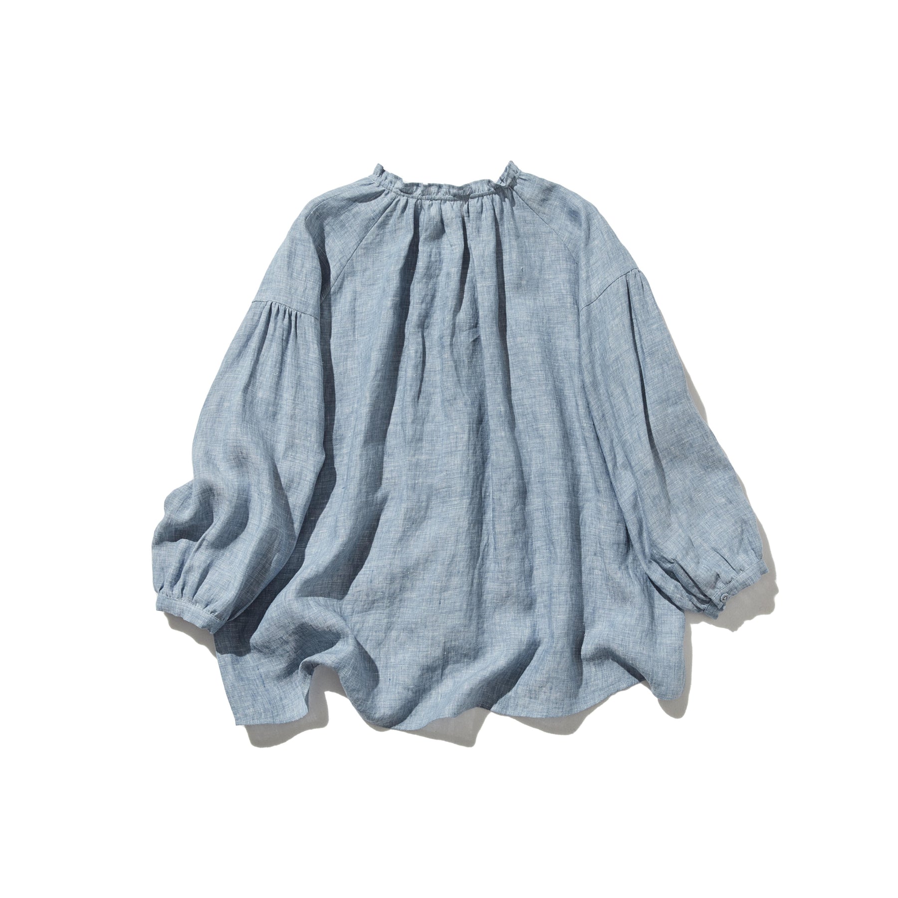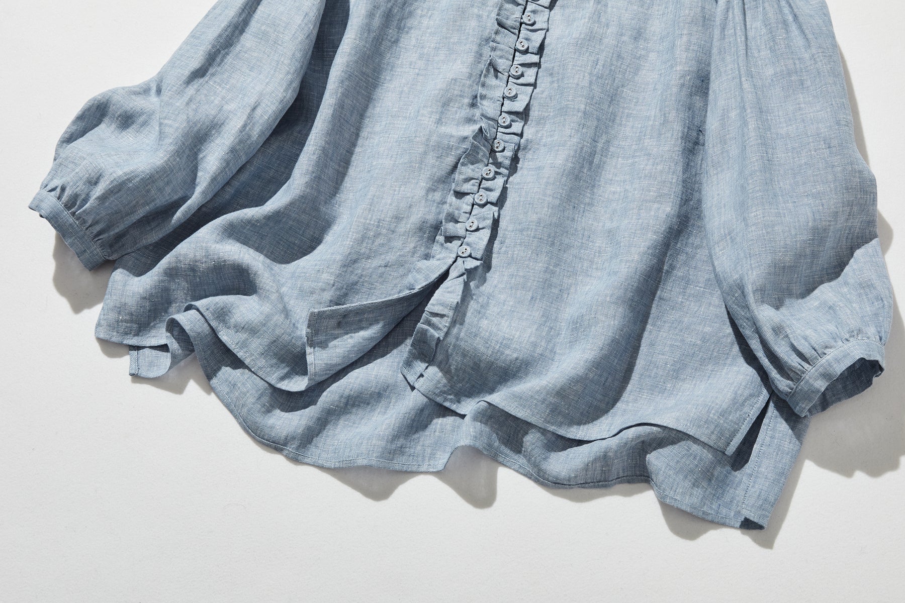 季節を問わず活躍する万能アイテム フランス産リネン リネンブラウス 250213麻のさわやかな風合いを存分に楽しめる、風通しの良い素材で仕上げました。経糸と緯糸に異なる色の糸を使用した平織り技法により、深みのある上品な生地感を実現。フランス産リネンの高級感が際立ちます。しゃりっとしたドライな質感は、肌に触れた時の心地よさが特徴。洗濯を重ねるごとに、色合いと風合いが変化していく過程も楽しみの一つです。デザインのポイント:・前立てを飾るフリルが、ほのかな可愛らしさを演出・ワイドシルエットで、ゆったりとした着心地と抜け感を実現・シンプルながらも存在感のあるデザインで、カジュアルからセミフォーマルまで幅広く活躍スタイリングの提案:・春~夏:シンプルなホワイトパンツと合わせて清涼感を・秋:カーディガンやジャケットと重ね着で季節感を演出・冬:タートルネックの下着と組み合わせて、一年中楽しめるアイテムにサイズ感:・ゆったりとしたシルエットで体型を選ばず着用可能このブラウスは、季節を問わず活躍する万能アイテム。洗いざらしの風合いが増すほどに味わい深くなり、まさに"育てる服"として末永くお楽しみいただけます。素材:リネン100%サイズ:身丈前59cm後67cm桁丈68cm袖口22cmバスト134cm裾134cm首回り40cmモデルさんの身長:158cm透け感:なし裏地:なしポケット:なし伸縮性:なし光沢感:なしシーズン:春、夏、秋