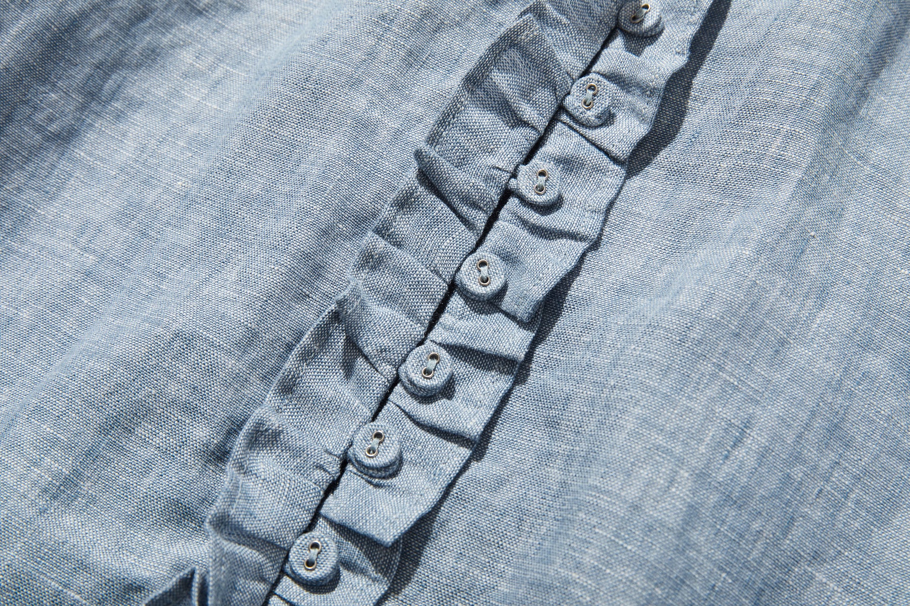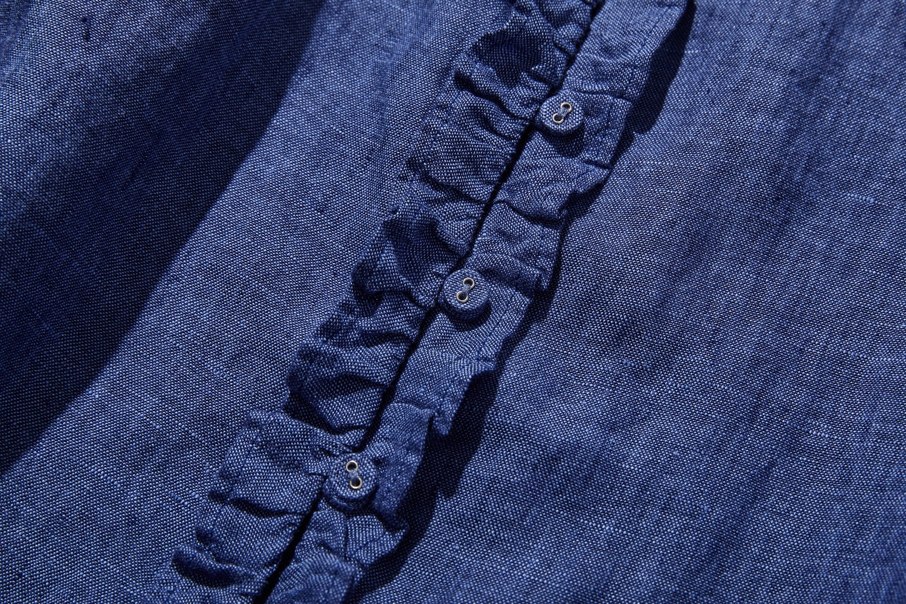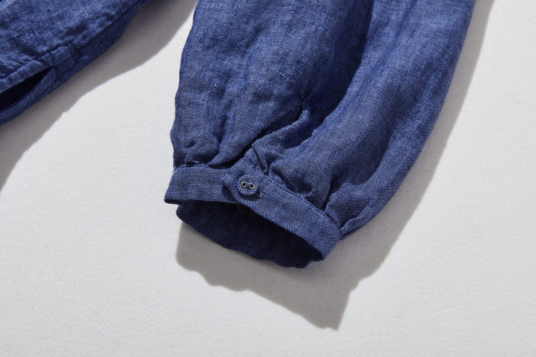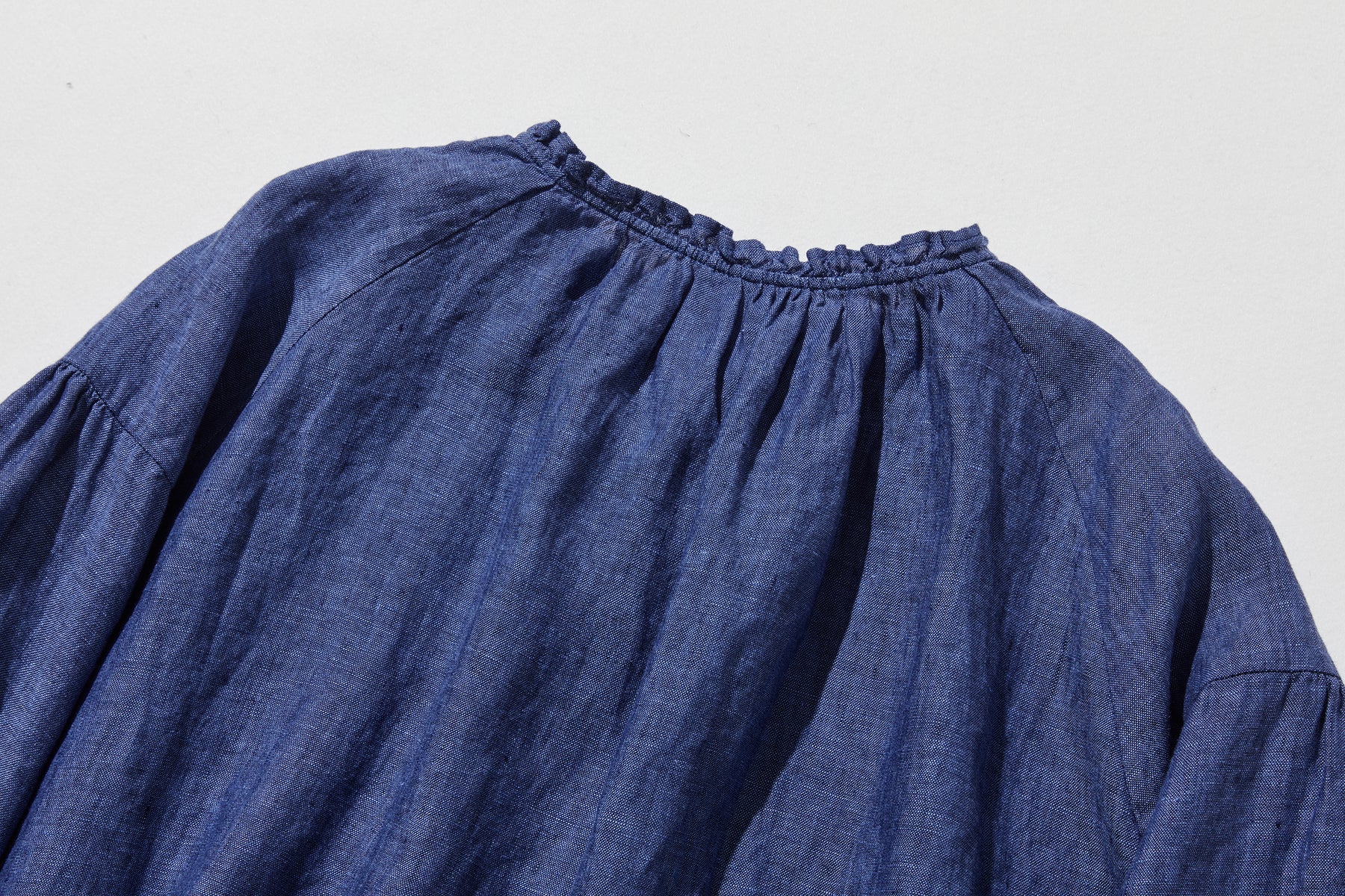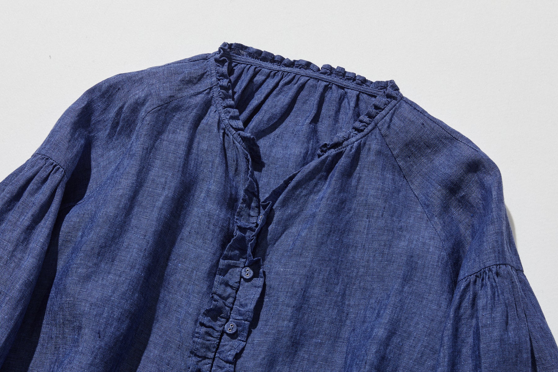季節を問わず活躍する万能アイテム フランス産リネン リネンブラウス 250213麻のさわやかな風合いを存分に楽しめる、風通しの良い素材で仕上げました。経糸と緯糸に異なる色の糸を使用した平織り技法により、深みのある上品な生地感を実現。フランス産リネンの高級感が際立ちます。しゃりっとしたドライな質感は、肌に触れた時の心地よさが特徴。洗濯を重ねるごとに、色合いと風合いが変化していく過程も楽しみの一つです。デザインのポイント:・前立てを飾るフリルが、ほのかな可愛らしさを演出・ワイドシルエットで、ゆったりとした着心地と抜け感を実現・シンプルながらも存在感のあるデザインで、カジュアルからセミフォーマルまで幅広く活躍スタイリングの提案:・春~夏:シンプルなホワイトパンツと合わせて清涼感を・秋:カーディガンやジャケットと重ね着で季節感を演出・冬:タートルネックの下着と組み合わせて、一年中楽しめるアイテムにサイズ感:・ゆったりとしたシルエットで体型を選ばず着用可能このブラウスは、季節を問わず活躍する万能アイテム。洗いざらしの風合いが増すほどに味わい深くなり、まさに"育てる服"として末永くお楽しみいただけます。素材:リネン100%サイズ:身丈前59cm後67cm桁丈68cm袖口22cmバスト134cm裾134cm首回り40cmモデルさんの身長:158cm透け感:なし裏地:なしポケット:なし伸縮性:なし光沢感:なしシーズン:春、夏、秋
