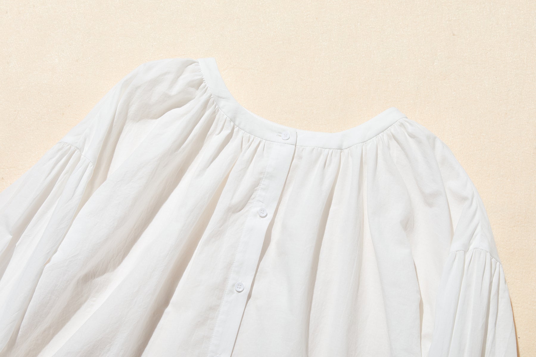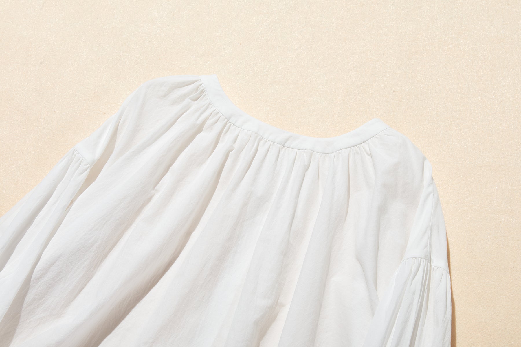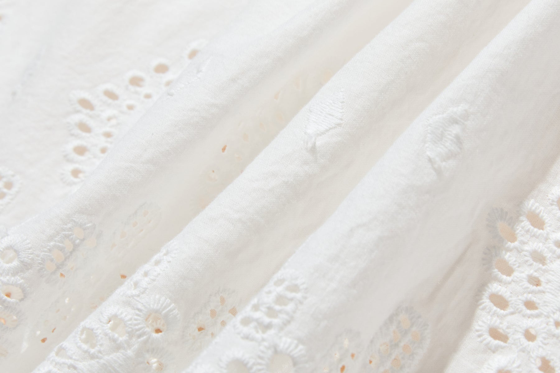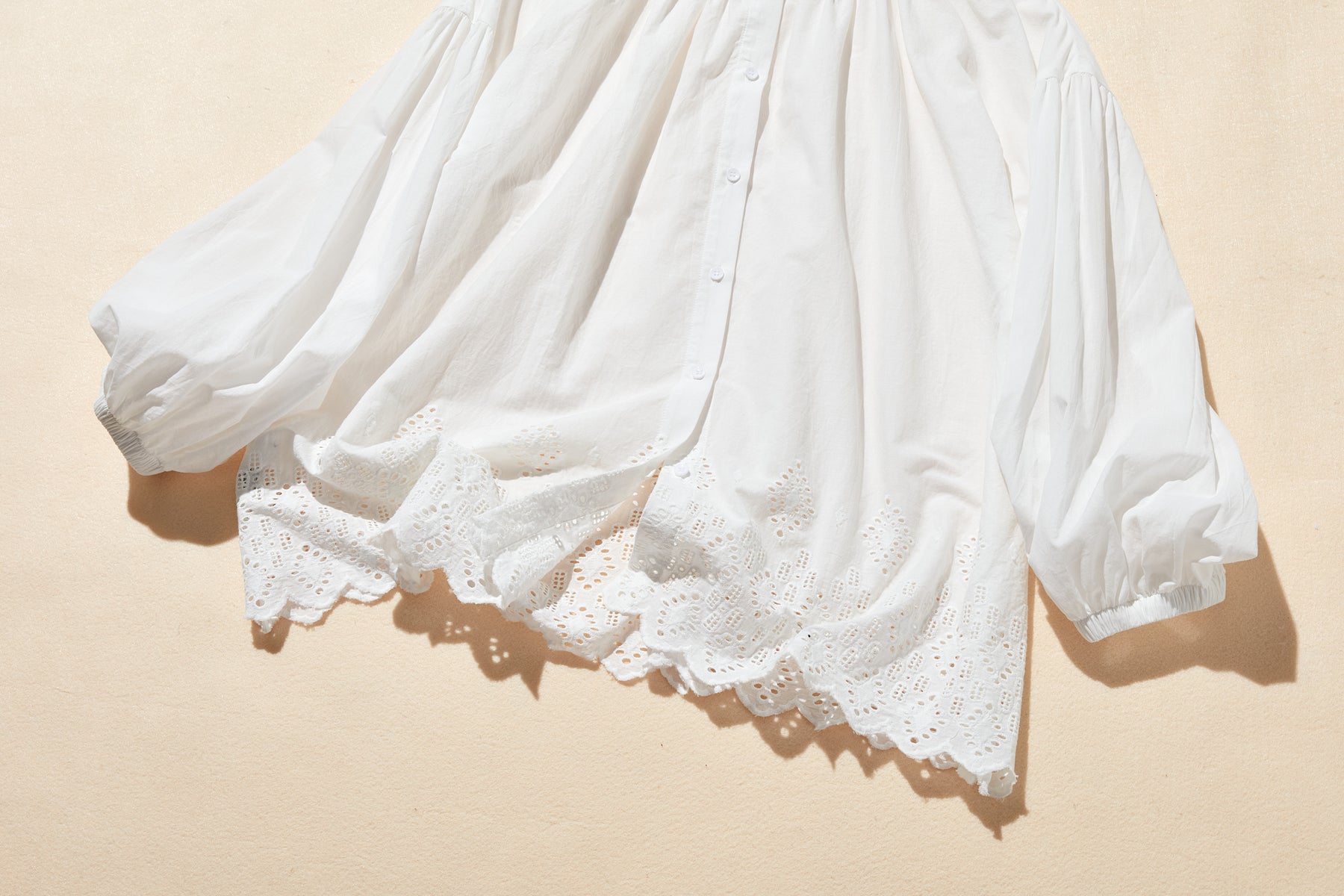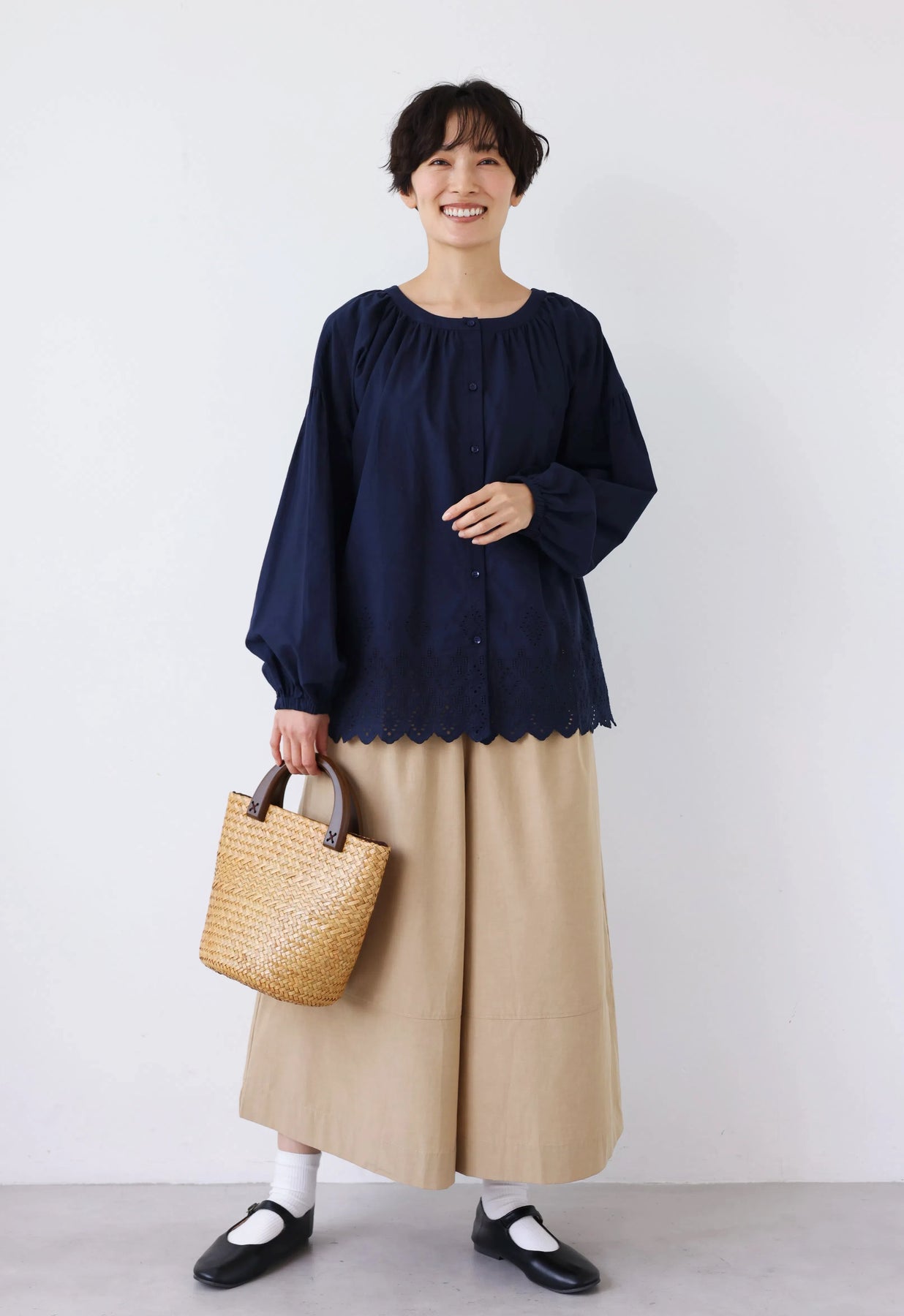 【繊細なスクラップ刺繡が華やか】オールシーズン愛用できる綿素材レースブラウス 前後2way 250911【商品の特徴】★心地よい肌触りが自慢のやわらかな綿素材で仕立てました。薄手で軽やかながらも、ほど良い張りと通気性を兼ね備えており、春夏はもちろん、秋までロングシーズンにわたり快適にお召し入れいただけます。★前後どちらもお使いいただける2WAYデザイン。★一番の特徴は、身頃と袖に大胆に施されたスクラップ刺繡。繊細でありながらも存在感があり、上品で華やかな印象をお届けします。シルエットは動きやすい適度なゆとりを残した設計で、ロマンチックなディテールとナチュラルな素材感が絶妙なバランスで調和◎。【カラー紹介】ホワイト: 清潔感あふれる定番カラー。刺繡の繊細な美しさが際立ち、どんなコーディネートにも合わせやすい万能色です。ネイビー: 落ち着いた上品さが魅力の深みのあるカラー。清楚な雰囲気の中に、知的な印象をプラスします。【コーディネートのご提案】エレガントスタイル: スラックスやストレートスカートと組み合わせて、大人の上品な仕事着やデート着に。カジュアルスタイル: デニムのスキニーパンツやチノパンツと合わせれば、刺繡の華やかさが程よいアクセントに。季節によっては、ジャケットの下から袖の刺繡だけをのぞかせる重ね着もおすすめです。春夏の着こなし: 素材が薄手で通気性が良いので、一枚でもさらりとご着用いただけます。秋の重ね着: カーディガンやジャケットのインナーとして。レースの袖元や裾が重ね着のアクセントになり、おしゃれを格上げします。この機会に、四季を通じて大活躍間違いなしの一品を、ぜひお迎えください。素材:コットン100%サイズ:身丈65cm肩幅62cmバスト122cm桁丈79cm袖丈46cm袖口20cm首回り58cm裾138cm透け感:ややあり裏地:なしポケット:なし伸縮性:なし光沢感:なしシーズン:春、夏、秋