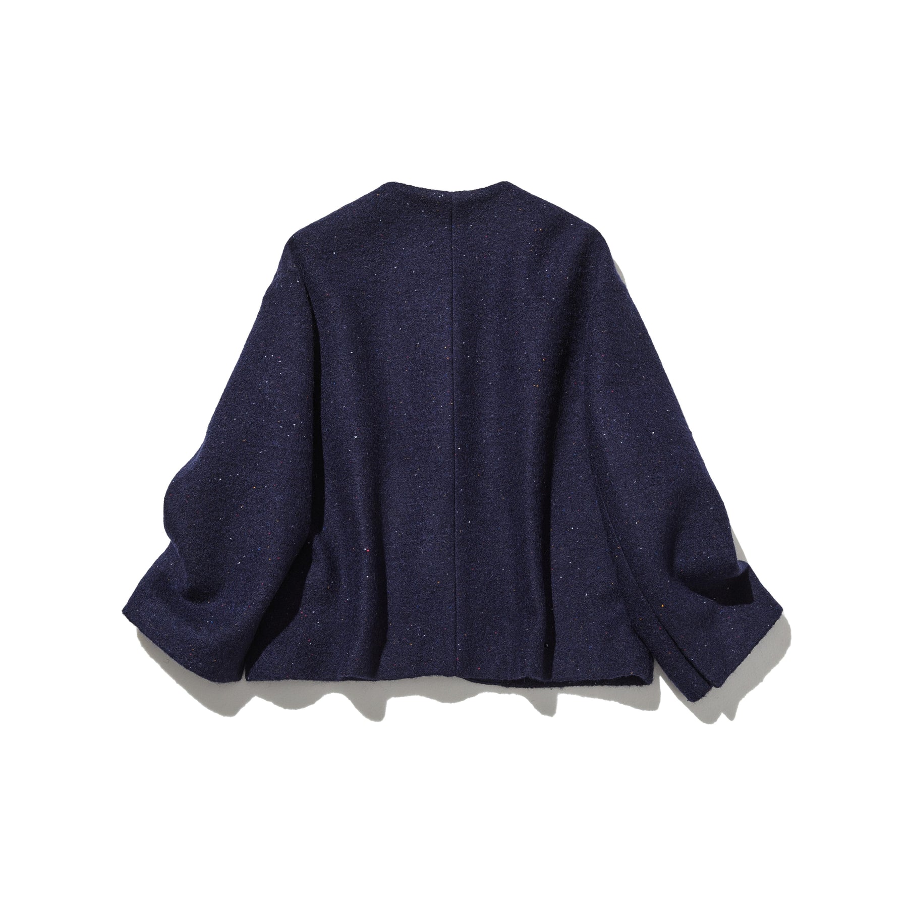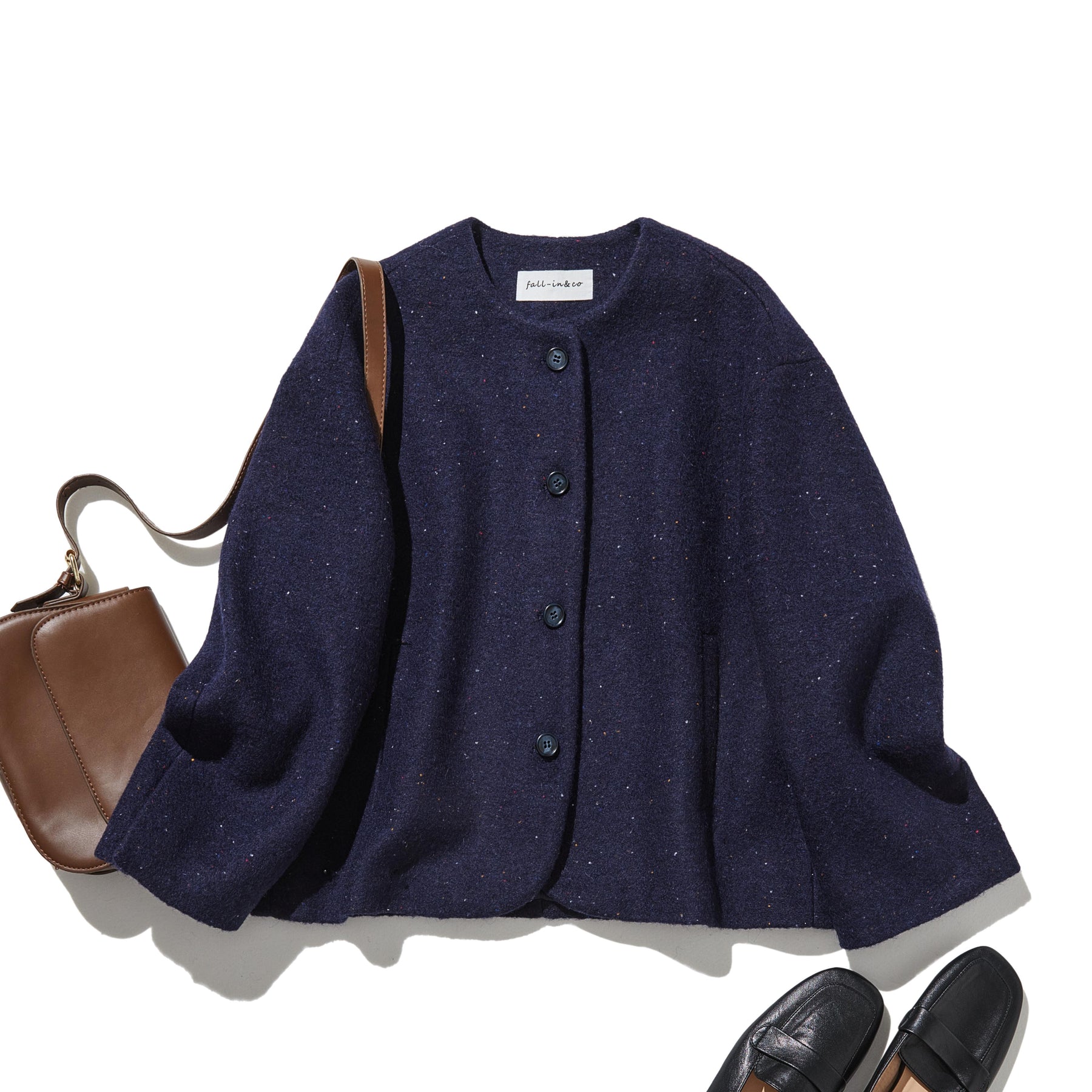 【デザイン】★上品な質感があるウール混生地で丁寧に仕立てたジャケット。★インナーや小物使いで雰囲気が変わるノーカラー仕立て★ワンピースにも合わせやすい短すぎず、長すぎず身丈★袖口スリット入りで折り返しのアレンジも簡単★余裕を持ってインナー合わせができるゆったりめシルエット★普段使いはもちろんのこと、お出かけのシチュエーションでもマッチするように上品さも併せ持った一着です。