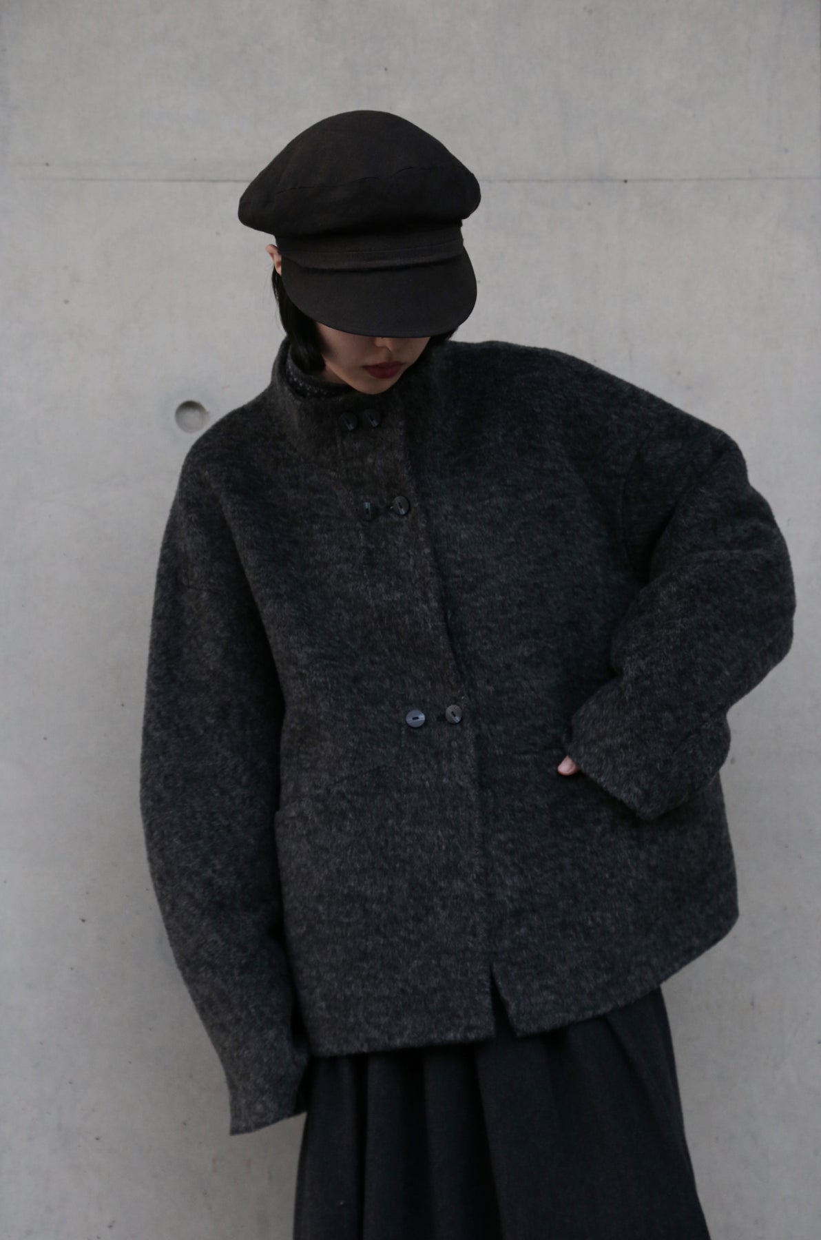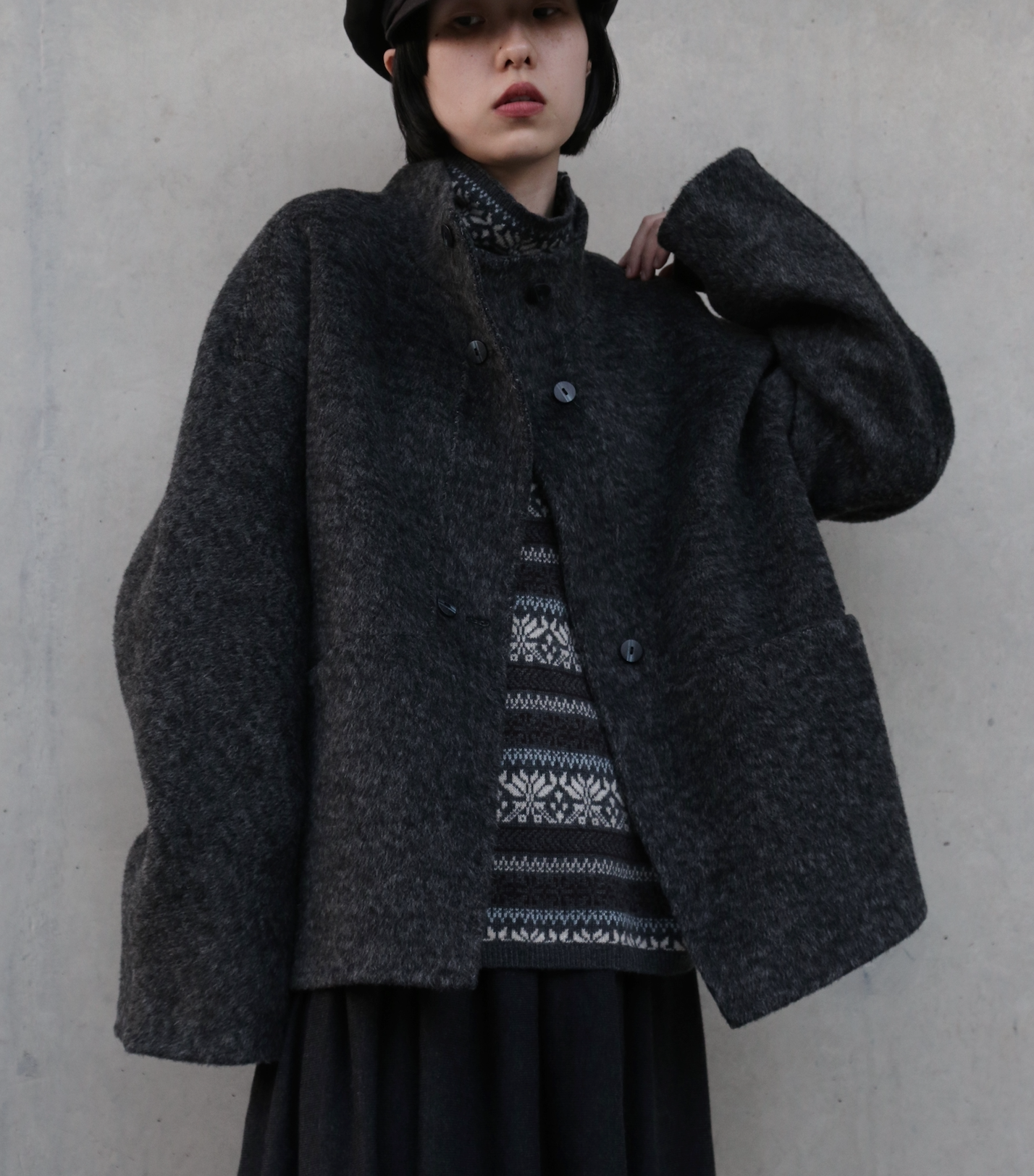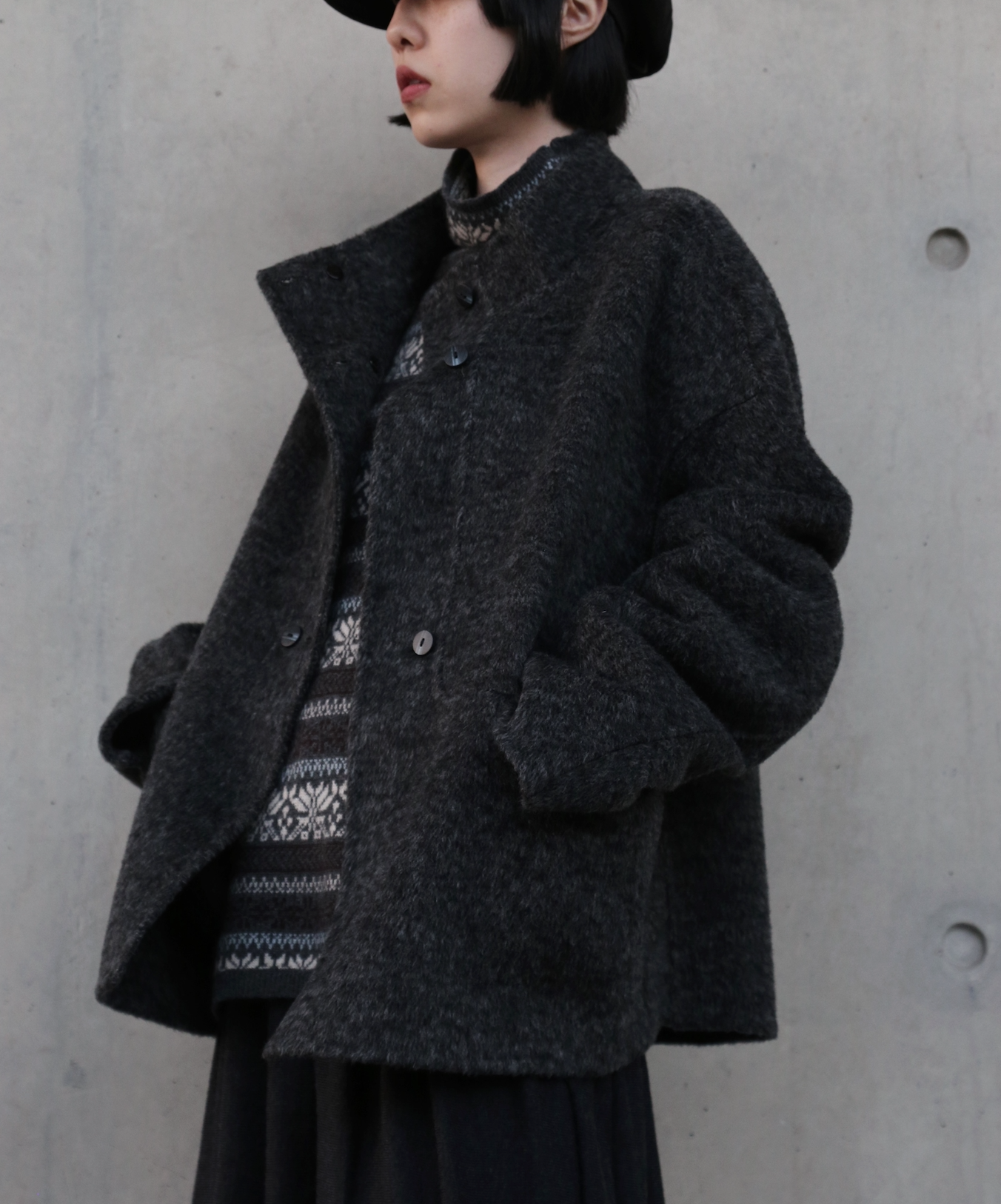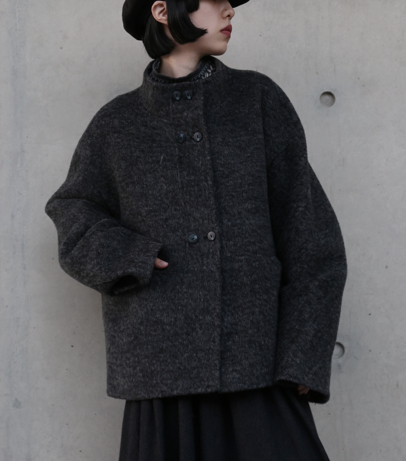 こちらは、上質なウール100%を「総手縫い」で仕立て上げた、ハイネックのショートコートです。寒い季節にうれしい防寒性と上品さを兼ね備え、ゆったりとしたHラインシルエットが、さまざまなスタイルを華やかに彩ります。