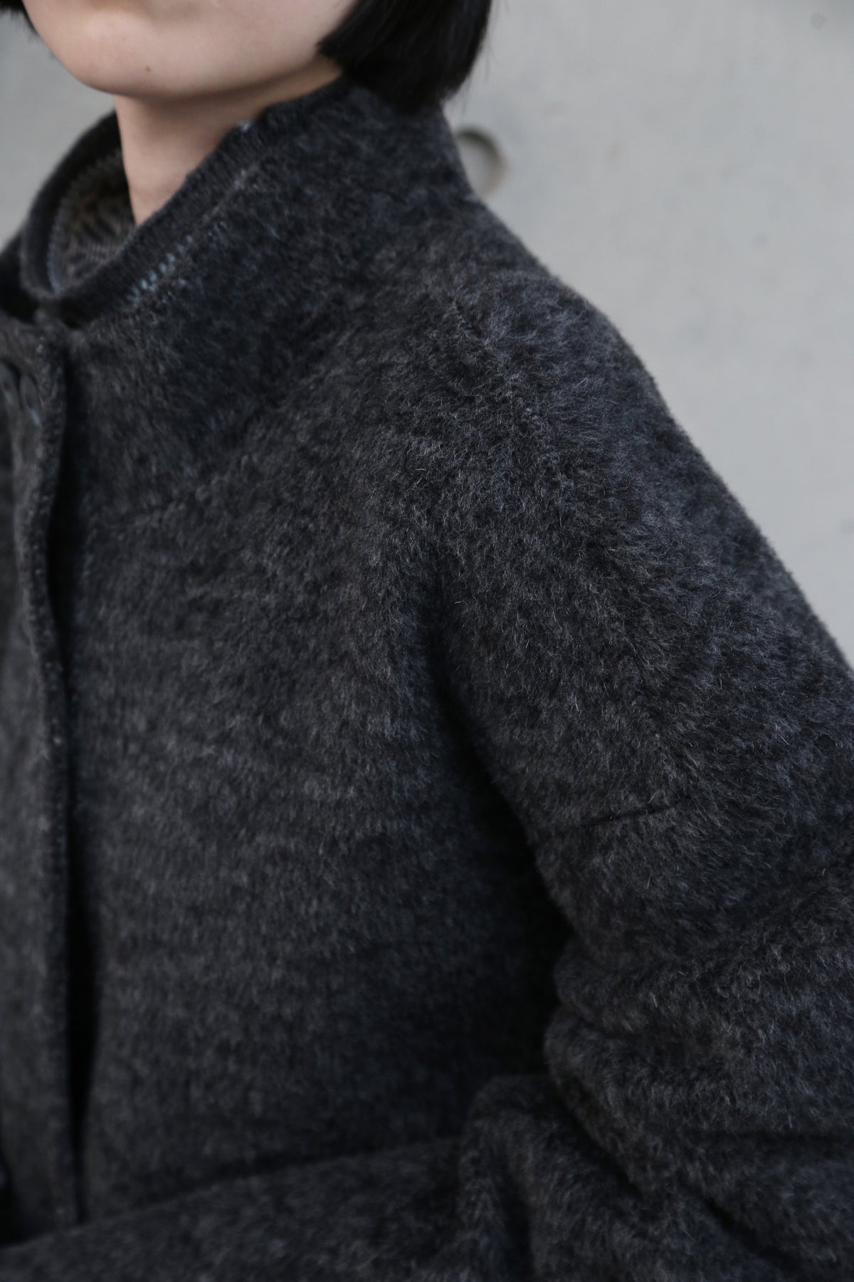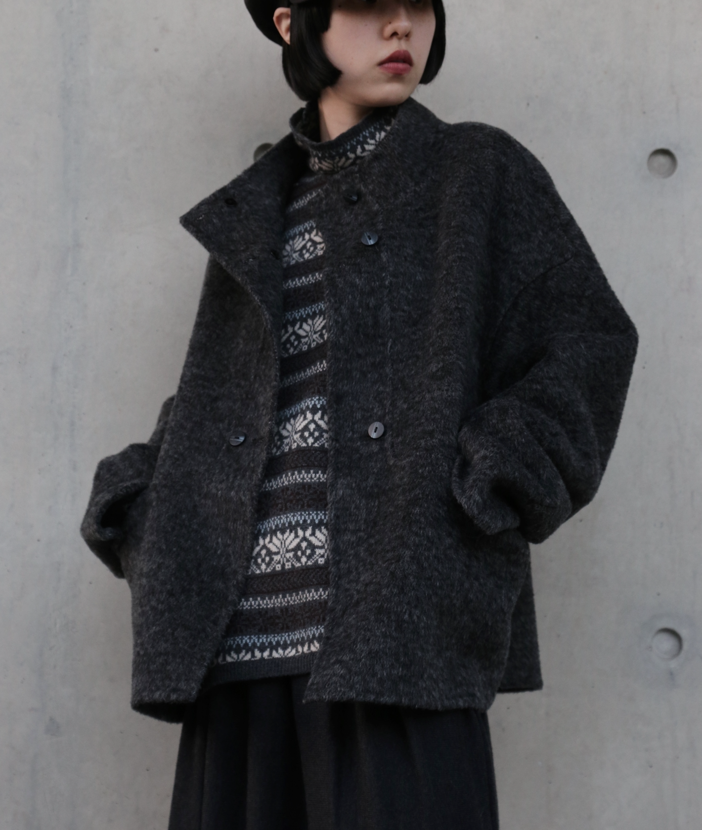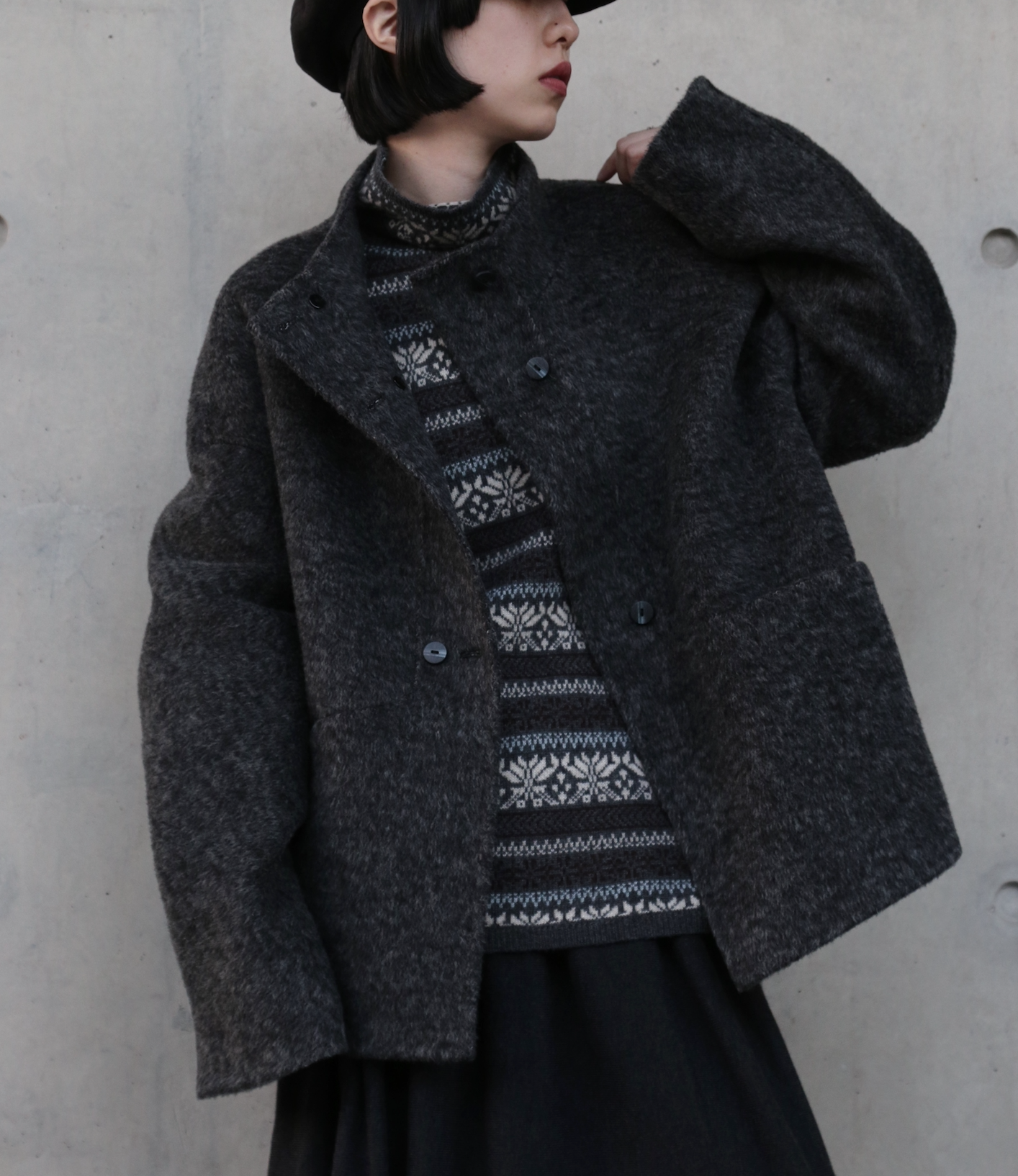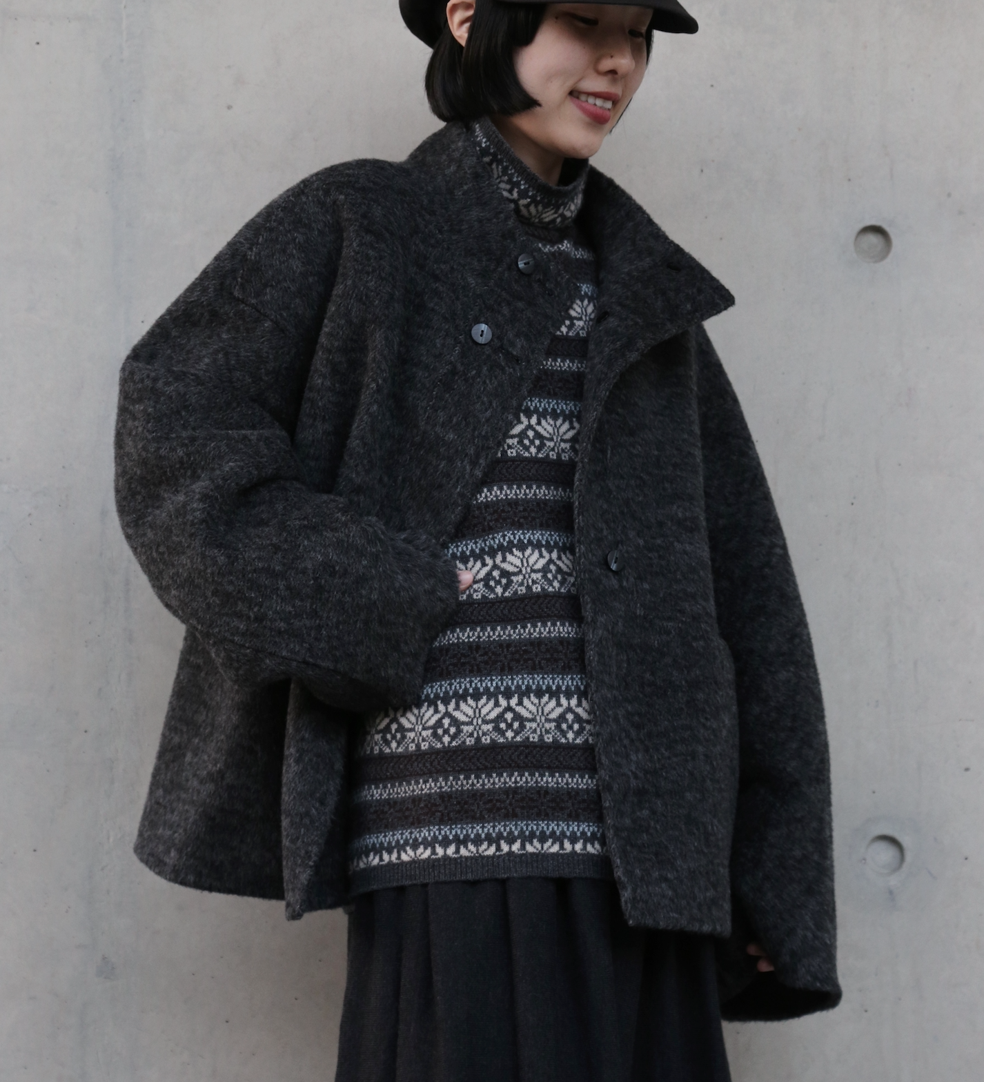 こちらは、上質なウール100%を「総手縫い」で仕立て上げた、ハイネックのショートコートです。寒い季節にうれしい防寒性と上品さを兼ね備え、ゆったりとしたHラインシルエットが、さまざまなスタイルを華やかに彩ります。