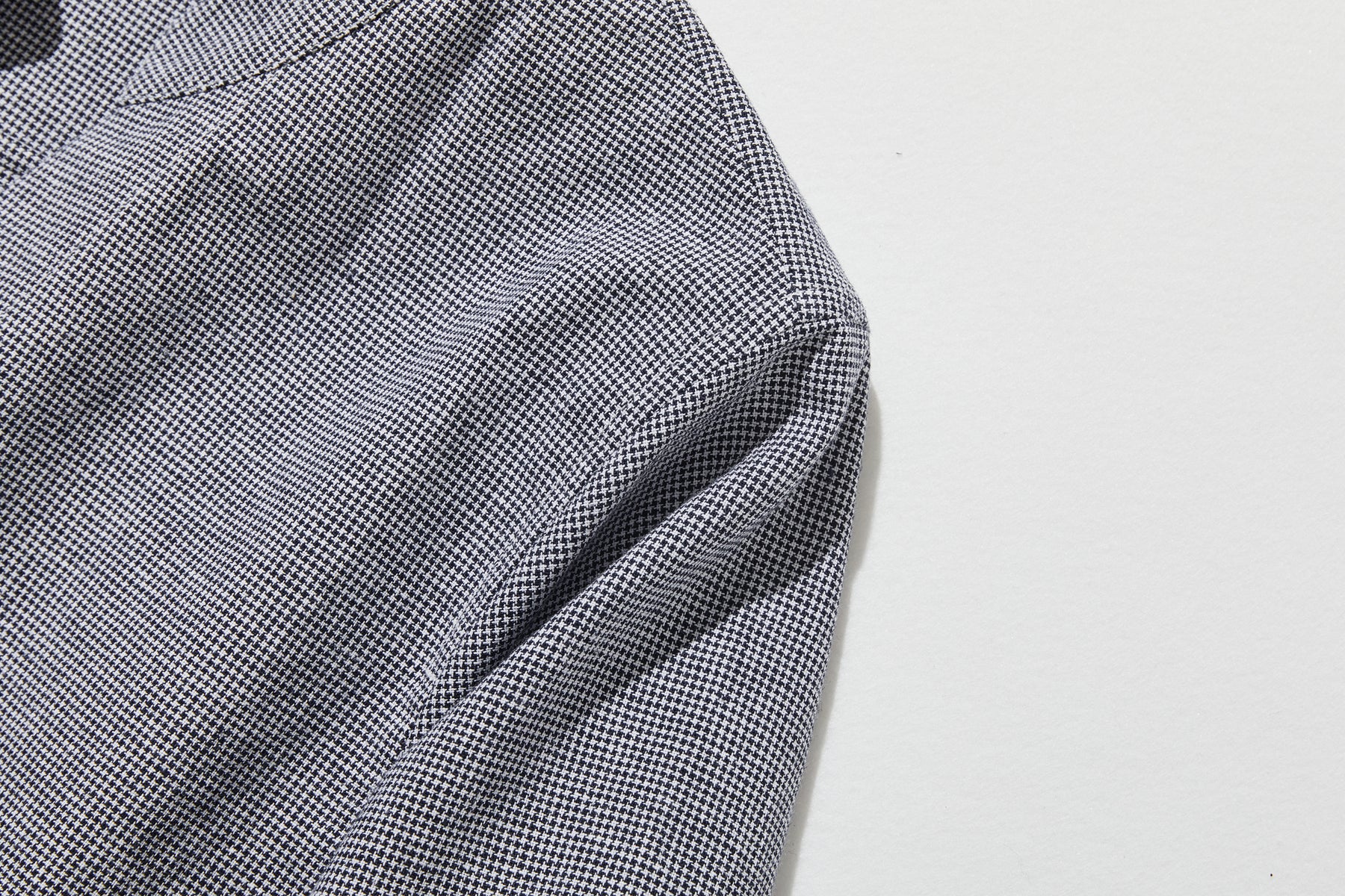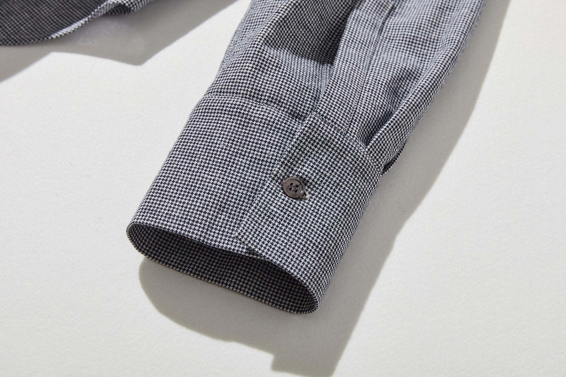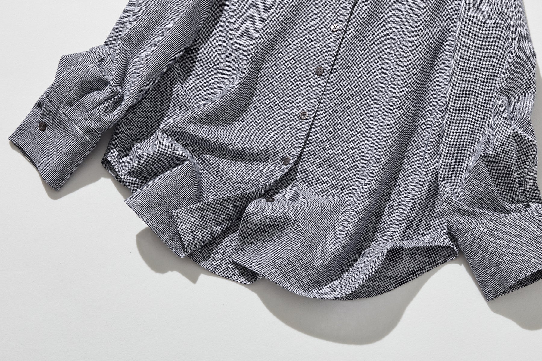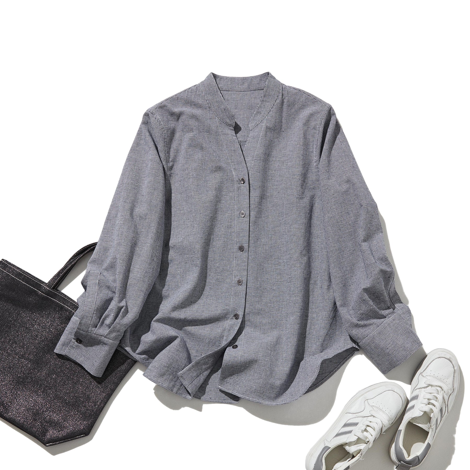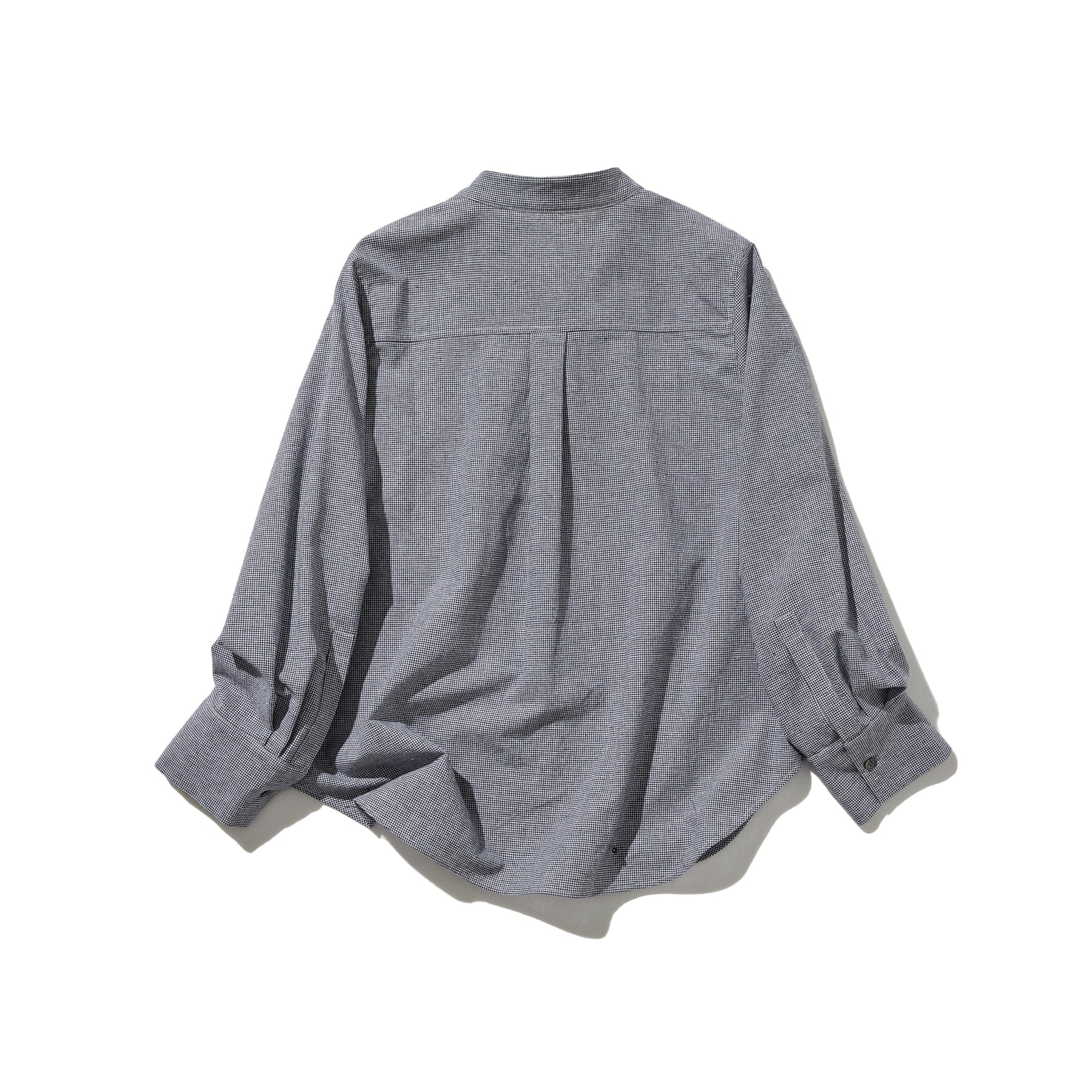 年間を通して快適に着れるシャツ 小千鳥格子コットンリネンシャツ 長袖 250812こちらは、今シーズン登場した小千鳥格子のロングスリーブシャツ。上質なコットンリネン素材で、年間を通して快適にお召し入れいただけます。着るシーンや組み合わせるアイテムによって、さまざまなスタイルでお楽しみいただける一品です。【商品の特徴】✔️ すっきりとした襟元とスタイリッシュなシルエットスキッパーネックと低めのスタンドカラーが清潔感ある印象に。前後差をつけたラウンドヘムが、横や後ろから見てもきれいなシルエットをかなえます。✔️ ゆったりワイドシルエット × Vネックで大人の洗練さ広めのシルエットで動きやすくリラックスした着心地でありながら、Vネックが首元をすっきりと見せ、大人の女性らしい上品な雰囲気に。✔️ こだわりのバックデザインで羽織り映え抜群後ろ裾をやや長めにデザイン。カーディガンのように羽織ったときも、こなれたスタイリッシュ感が演出できます。✔️ 通年快適なコットンリネン素材吸湿性・通気性に優れ、春夏は涼しく、秋冬は重ね着しても蒸れにくい素材。使うほどに風合いが深まっていく自然素材の良さを感じてください。✔️ 様々なボトムと合わせやすい汎用性パンツやスカート、ショートパンツなど、さまざまなアイテムと組み合わせやすく、カジュアルから少しおしゃれなシーンまで幅広く活躍します。【スタイリング例】• カジュアルな日に…デニムやパンツと組み合わせて、軽やかなルックに。サンダルやスニーカーでも映えます。• レイヤードスタイルで…タンクトップやキャミソールの上から羽織って。秋冬はジャケットやカーディガンの下に重ねても。• オフィスカジュアルとして…スラックスやストレートスカートと合わせて、涼しげな印象に。エプロンなどと組み合わせても◎。一枚あると、春夏秋冬を通して大活躍すること間違いなし。ナチュラルで上質な雰囲気をプラスしてくれる、大人の女性にぴったりのアイテムです。この機会に、ぜひお役立てください。素材:コットン45% リネン55%サイズ:身丈前65cm後67cm肩幅39cm袖丈56cmバスト104cmアームホール56cm袖口24cm裾114cm透け感:なし裏地:なしポケット:なし伸縮性:なし光沢感:なしシーズン:春、夏、秋