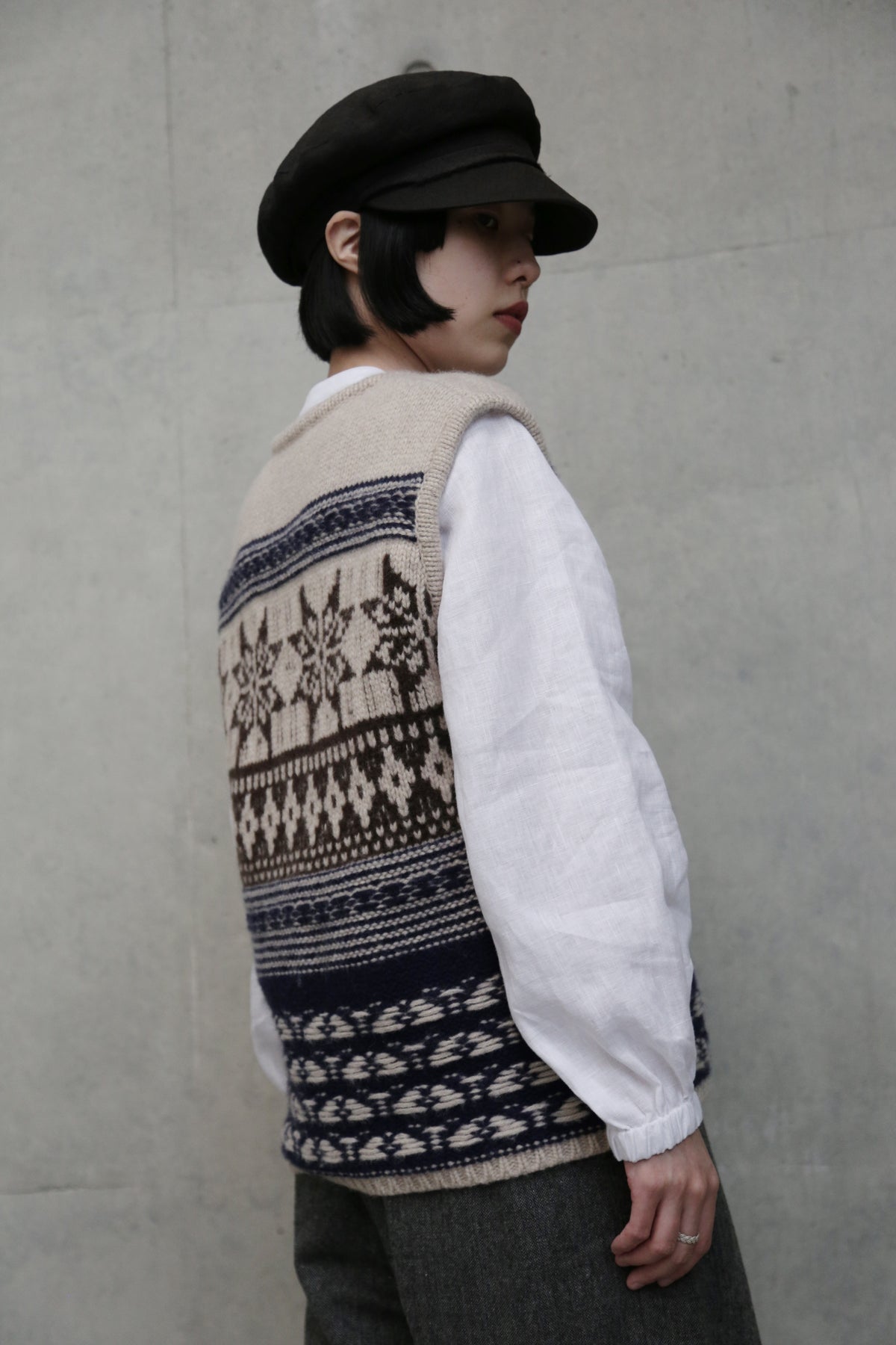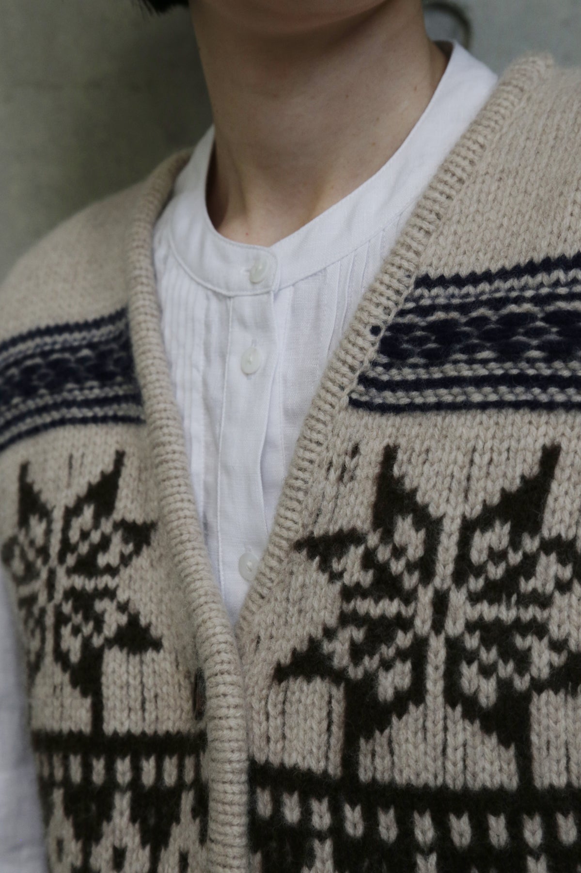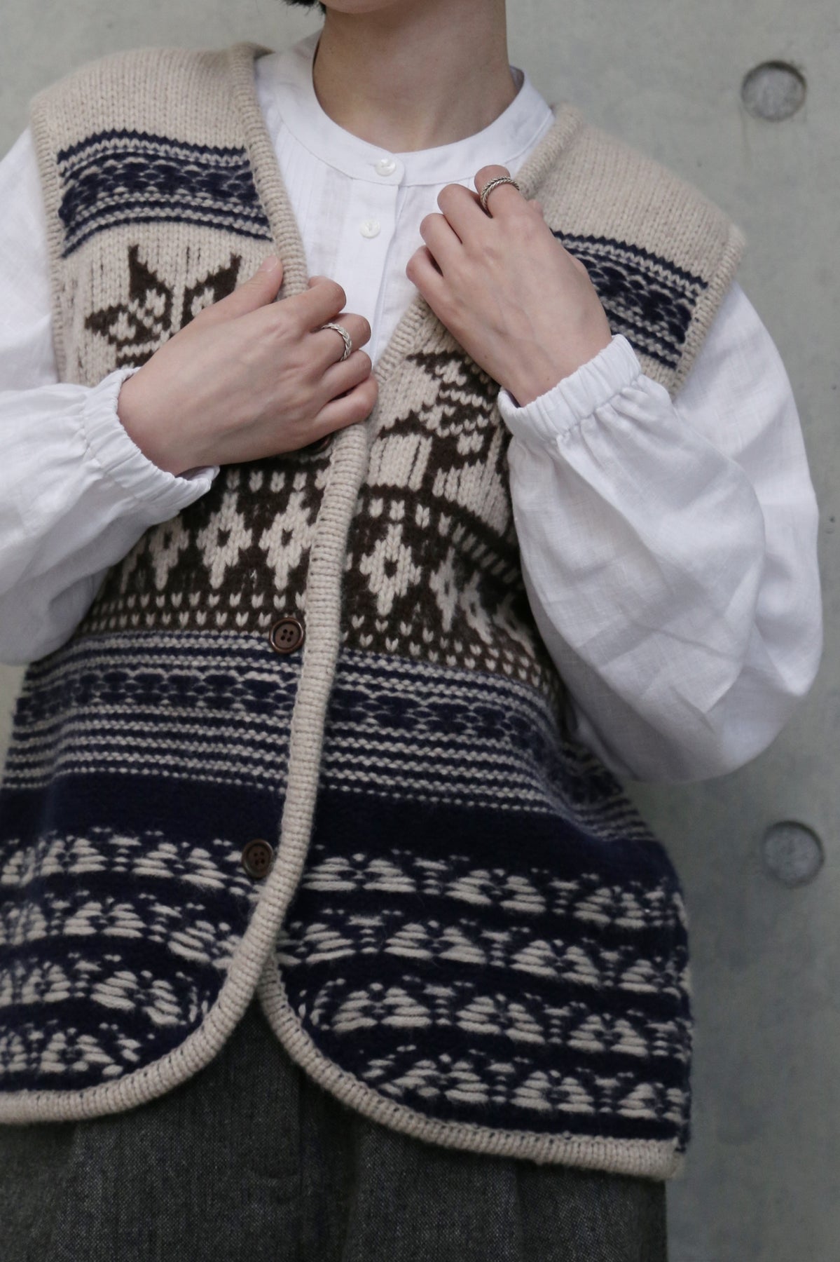 • 基本の重ね着:ワイシャツや薄手のタートルネックの上に羽織り、その上からコートやジャケットを。首元の模様がアクセントになり、スマートで暖かな印象に。
