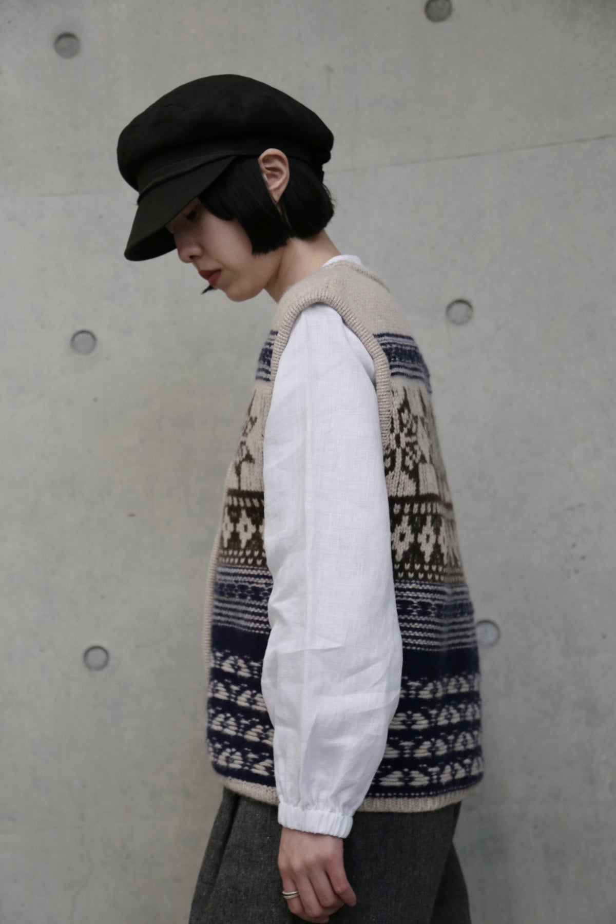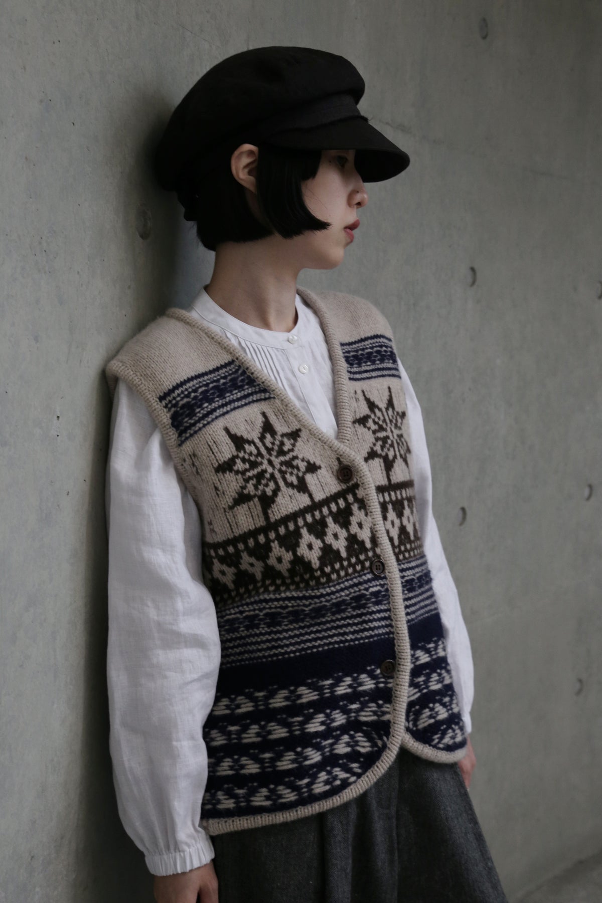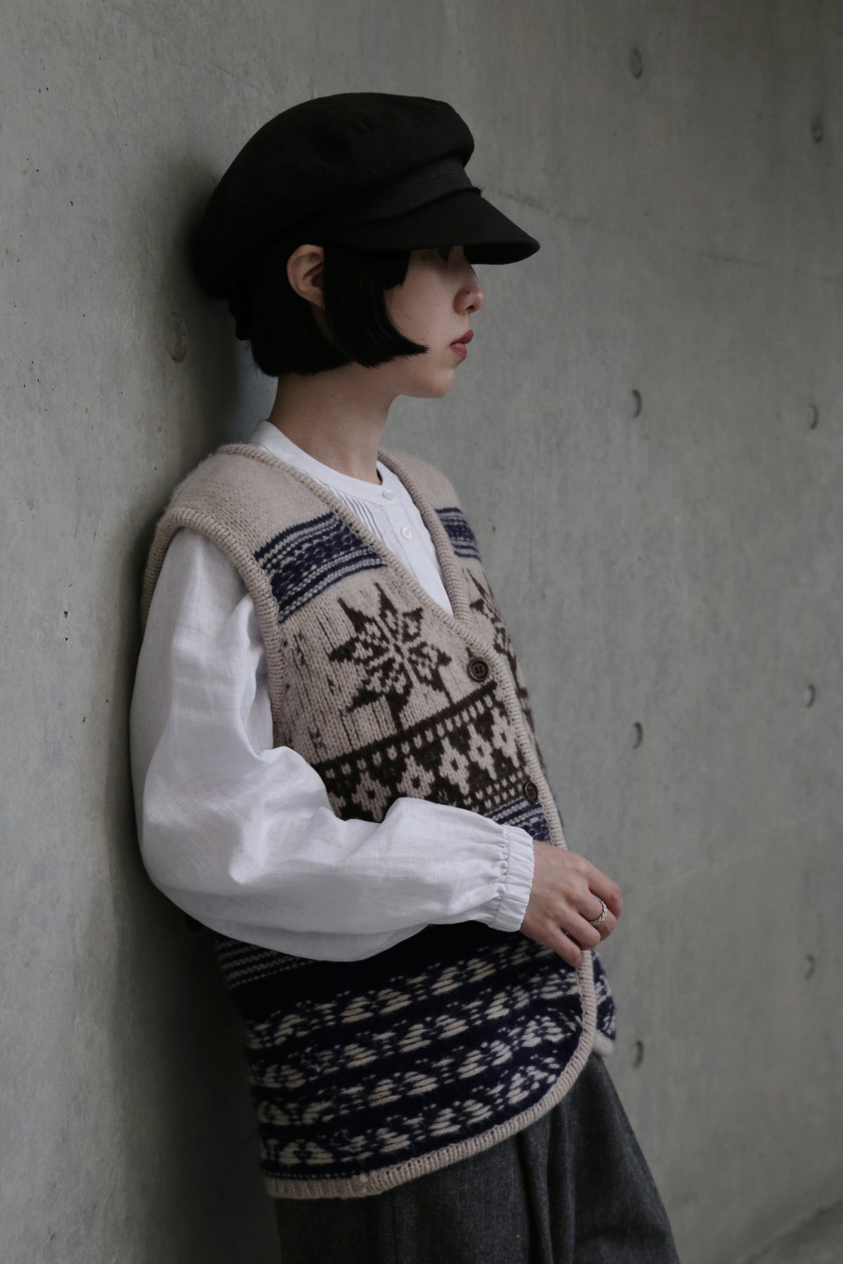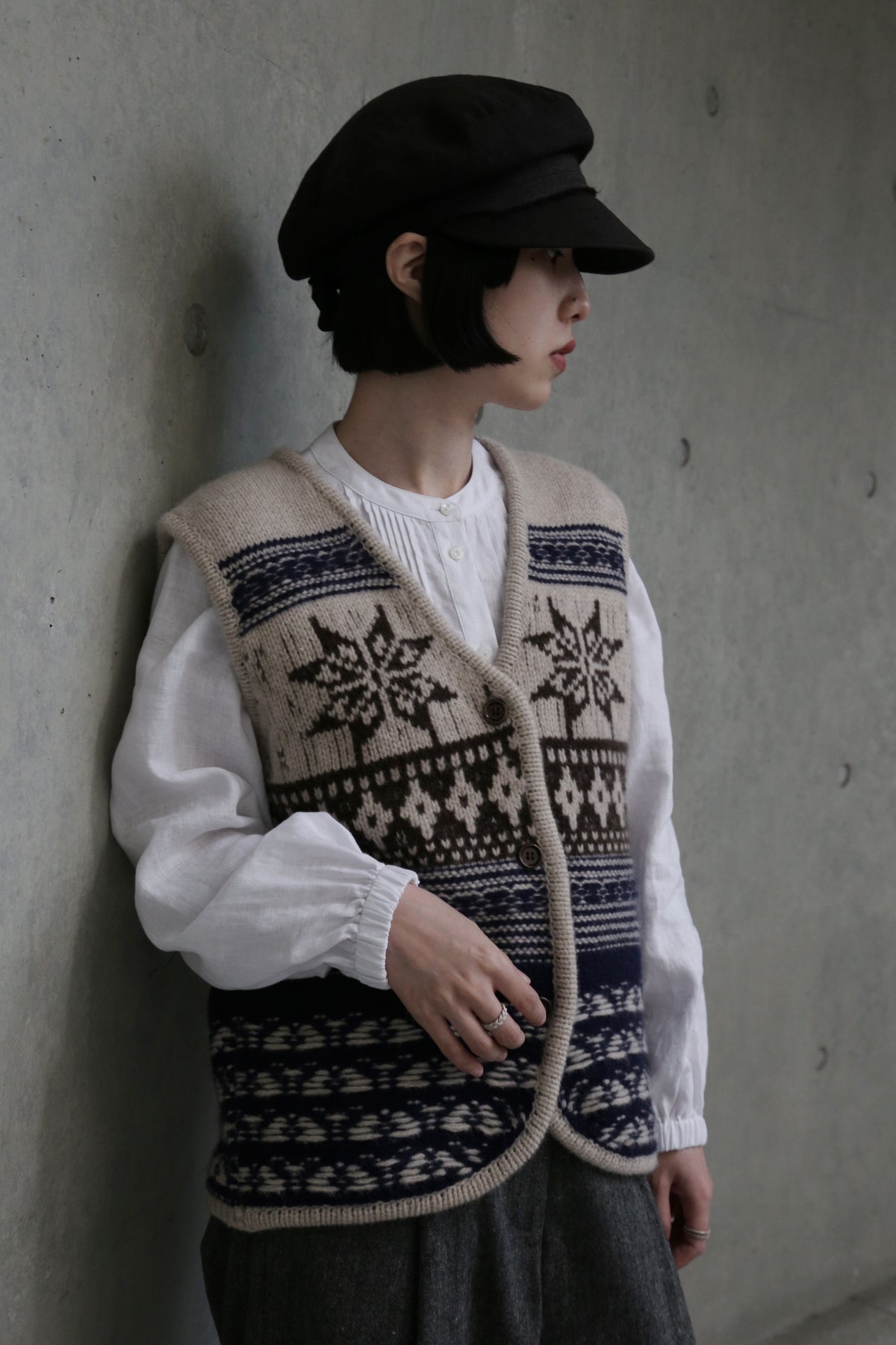 • 基本の重ね着:ワイシャツや薄手のタートルネックの上に羽織り、その上からコートやジャケットを。首元の模様がアクセントになり、スマートで暖かな印象に。