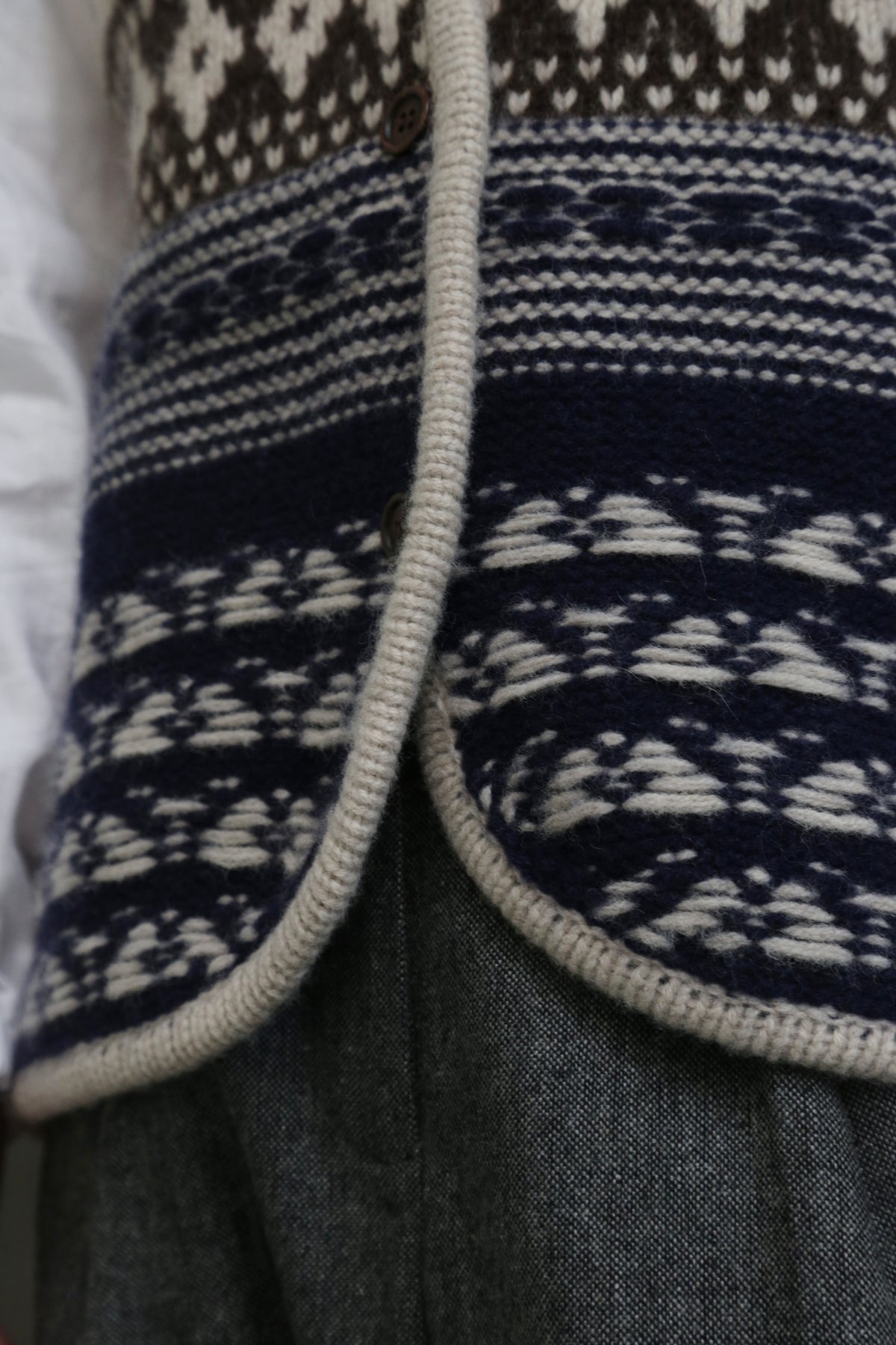 1. フェアアイル模様:ベージュ色の地に、深みのあるこげ茶と紺の伝統的なフェアアイル模様が、冬らしい上品な雰囲気を演出します。